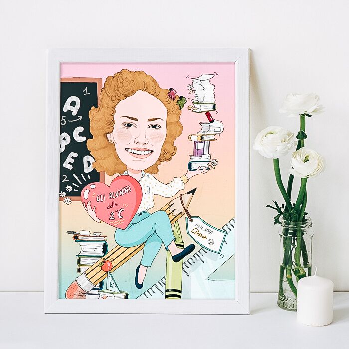 Questa bellissima illustrazione viene realizzata a mano in digitale da una bravissima e giovane illustratrice italiana. Caricate la foto del primo piano del vostro soggetto in alta definizione e la nostra illustratrice creerà una caricatura della vostra insegnante!