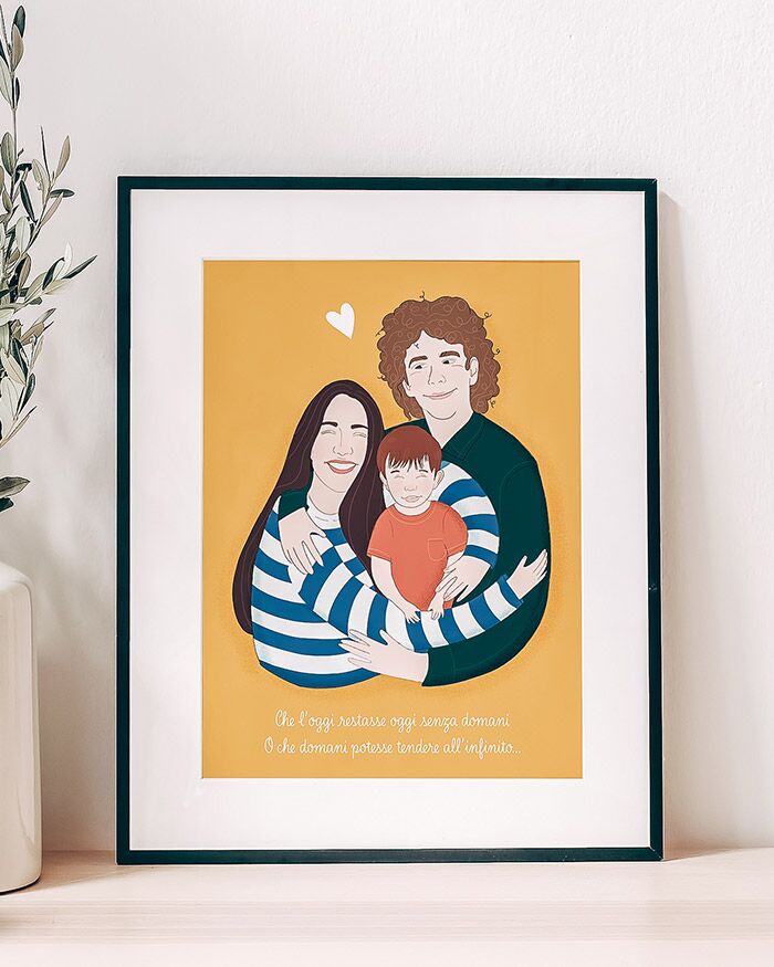 Realizza un regalo davvero unico e speciale con le nostre illustrazioni personalizzate. Una talentuosa giovane artista italiana è pronta a trasformare le tue foto in una tenera illustrazione che ha tocchi magici e poetici. Per realizzare il tuo ritratto personalizzato ti basterà acquistarlo tramite il sito specificando tutte le opzioni che ti vengono richieste e allegando delle foto dei personaggi da ritrarre (o in alternativa fornendone un’accurata descrizione sul campo dove vengono richiesti i particolari aggiuntivi). L’illustratrice saprà trasformare le foto unendo i personaggi in un delicato abbraccio. I personaggi possono avere gli occhi aperti o chiusi a scelta e di default vengono rappresentati con le gote rosse.