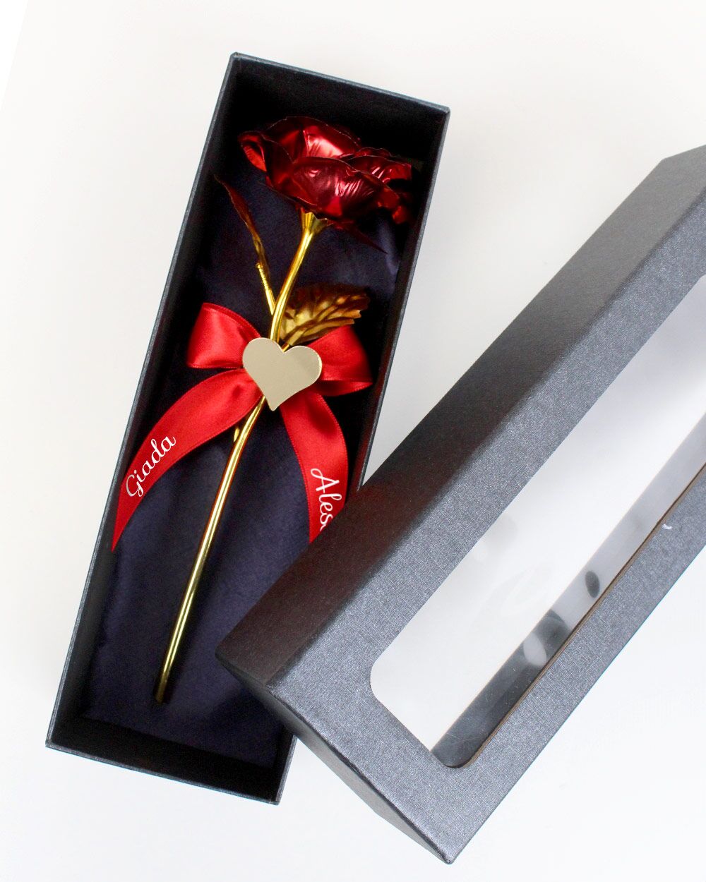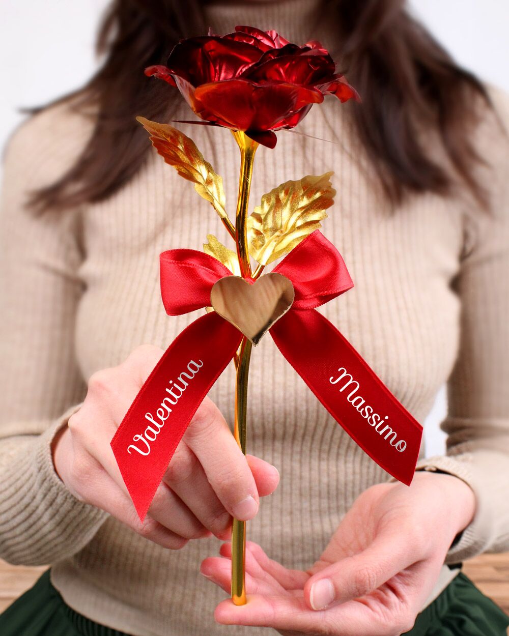 - Un Gestore d’Amore Creativo: La combinazione di una rosa rossa, il simbolo per eccellenza dell’amore, con la personalizzazione attraverso un nastro rende questo regalo un modo insolito e originale di esprimere i tuoi sentimenti.