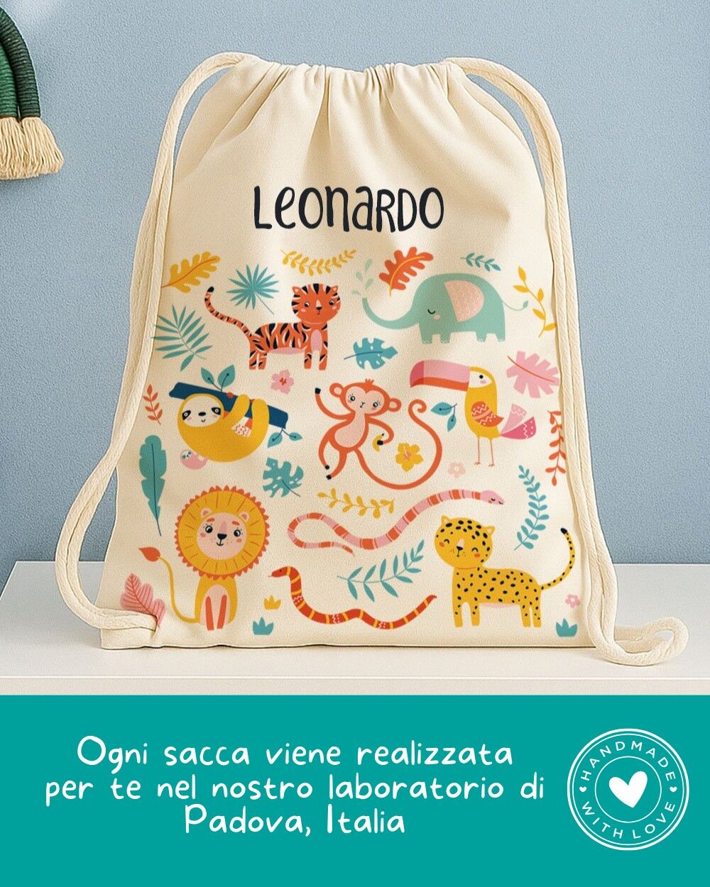 Sacca Asilo con Lacci Personalizzata con Nome e Animali della Giungla – Idea Regalo per Bambini, Ritorno a Scuola e Asilo, Back to School