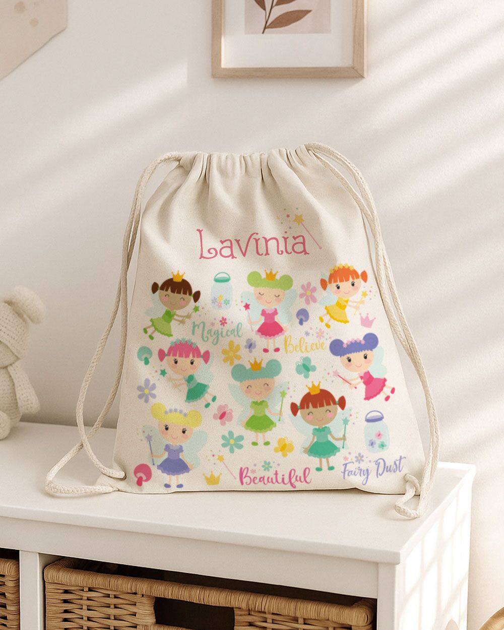 Con il suo stile fiabesco e la personalizzazione con nome, questa sacca con lacci per scuola e asilo non è solo utile, ma anche dolce e unica.