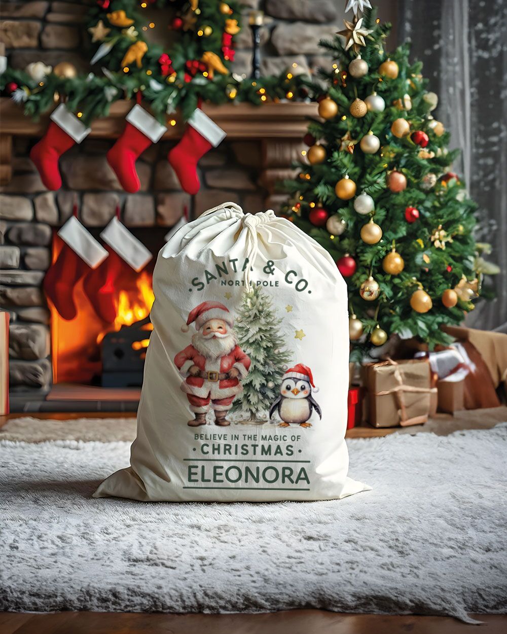 Cosa c’è di più magico del Natale? La Sacca di Babbo Natale Personalizzata con la dolcissima grafica di Babbo Natale e un tenero pinguino è il modo perfetto per portare la magia natalizia direttamente a casa tua!
