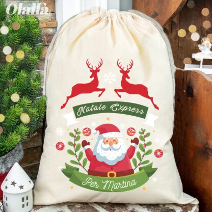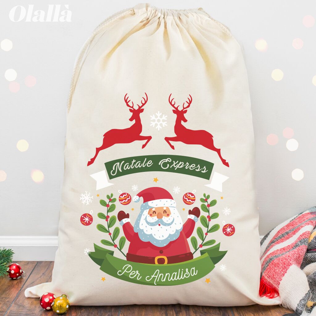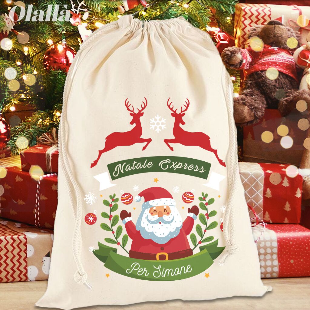 Sacca in 100 % cotone super resistente (200 g/m²) con chiusura a coulisse con cordino perfetta per contenere i tuoi doni natalizi ed arredare con stile la tua casa questo Natale.