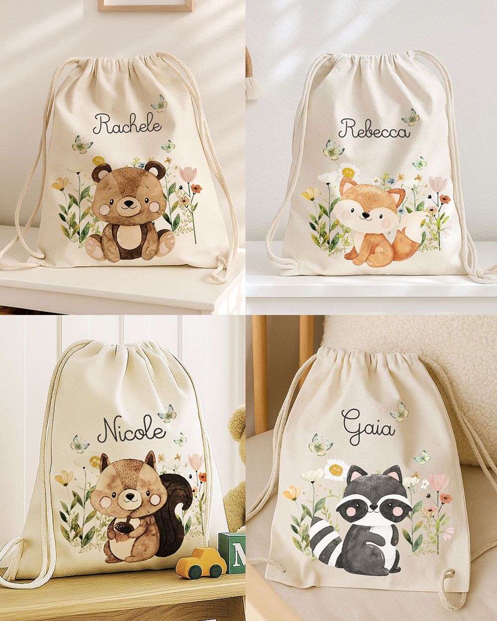 3. Design Personalizzabile e Adorabile: il design con l’illustrazione del buffo procione non è solo carino, ma anche adattabile. Puoi personalizzare la sacca con il nome del bambino, scegliere il colore del cotone tra diverse opzioni e selezionare il soggetto preferito per l’illustrazione, rendendo ogni sacca unica e speciale.