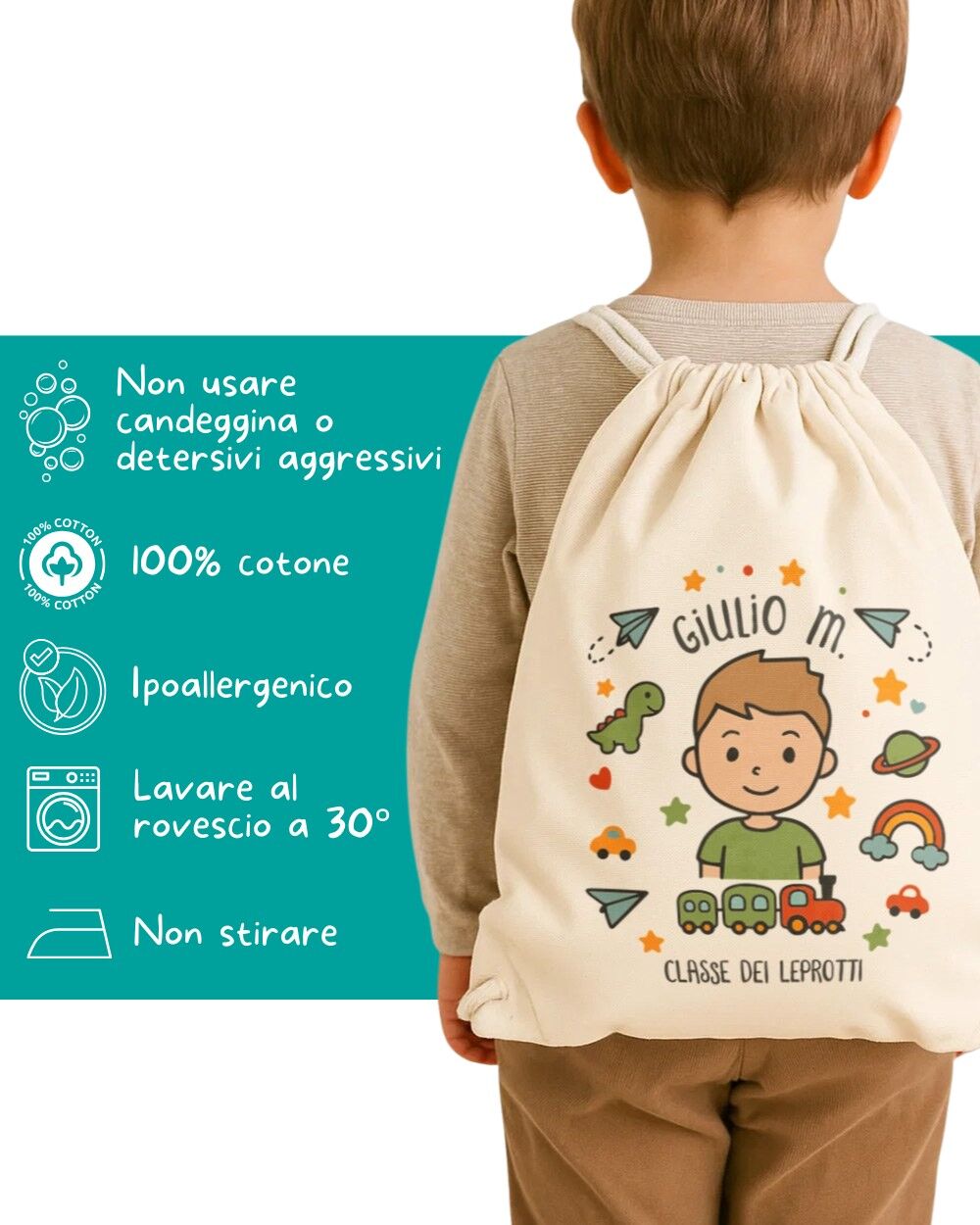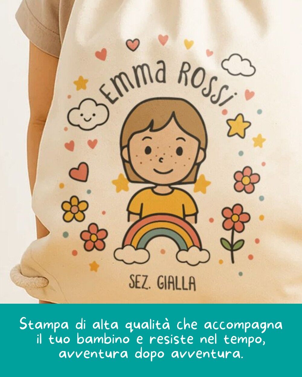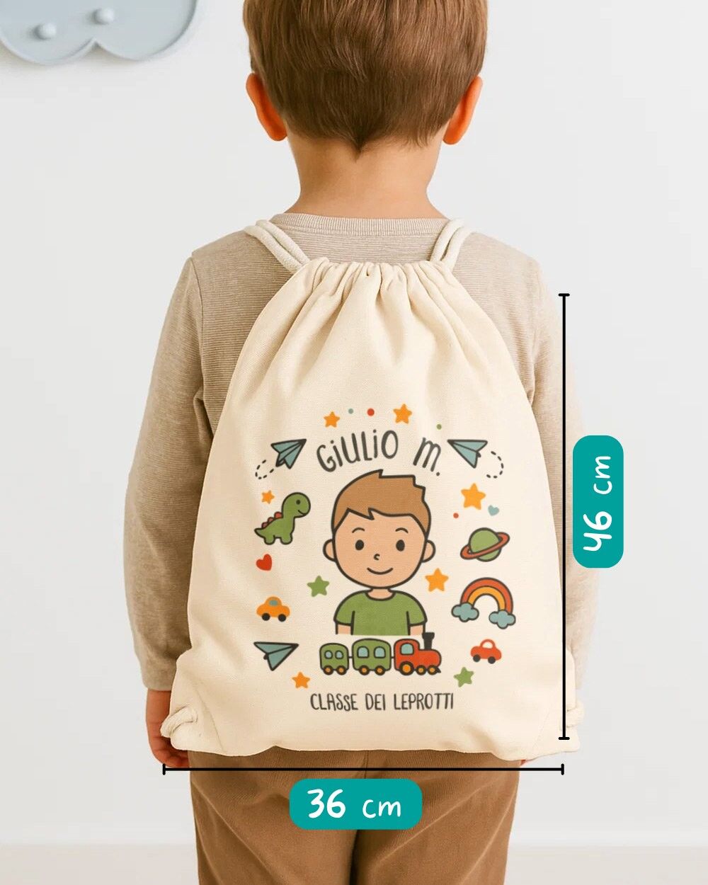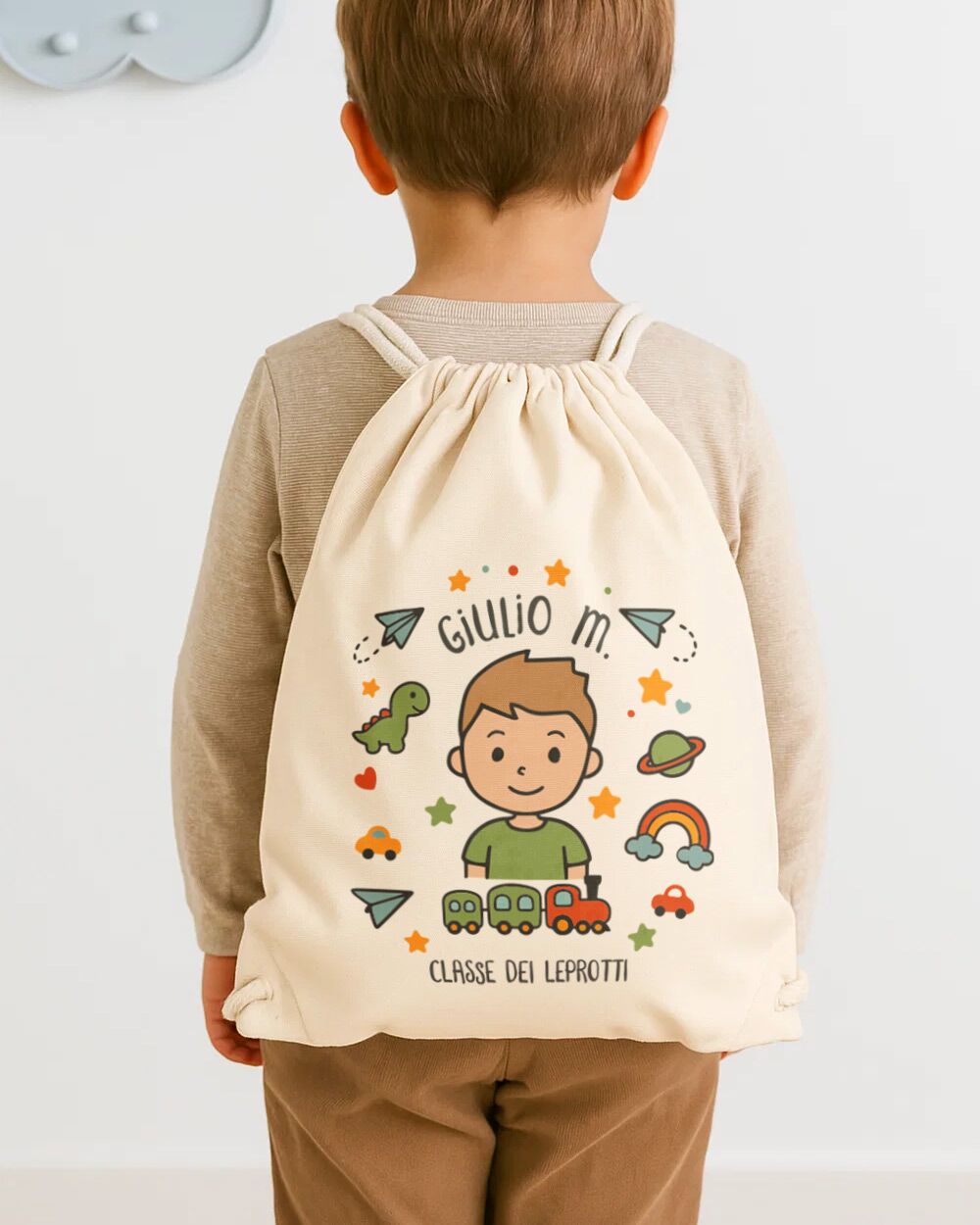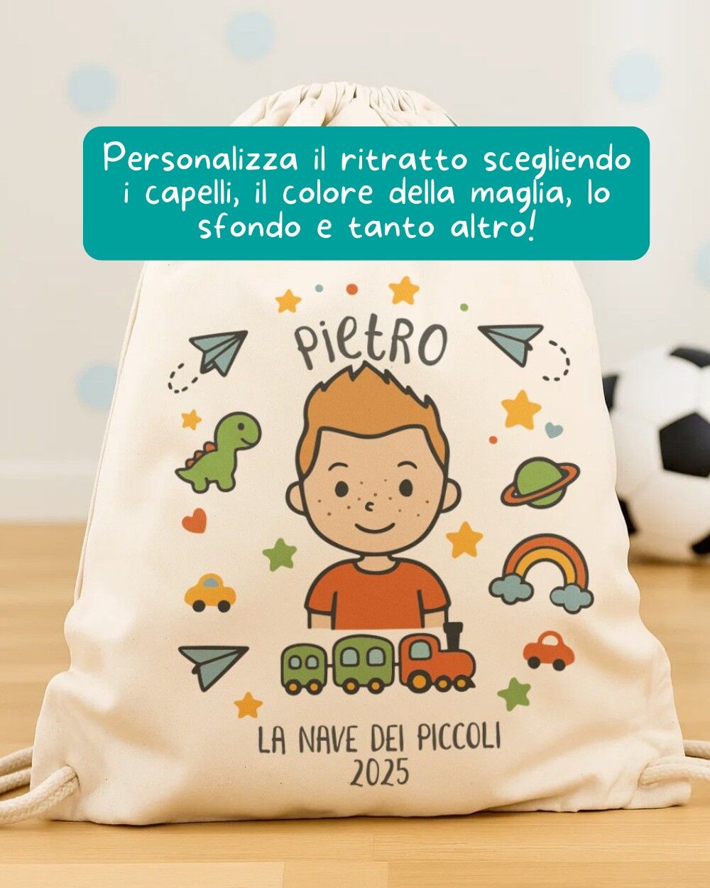 Durante l’ordine, potrai inserire il nome del bambino da stampare sulla sacca e scegliere ogni dettaglio del ritratto stilizzato, per un risultato davvero su misura.