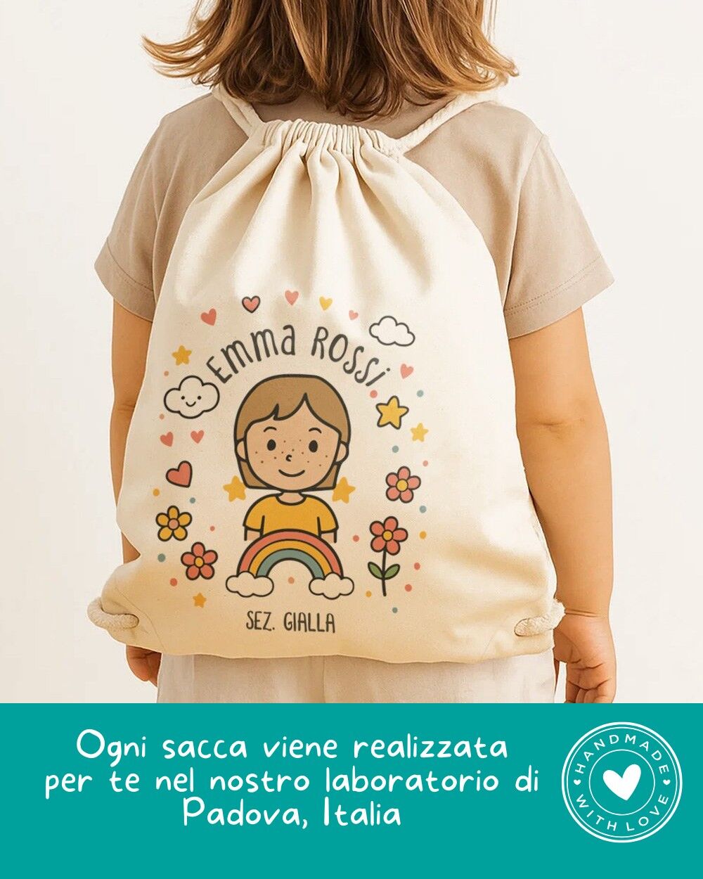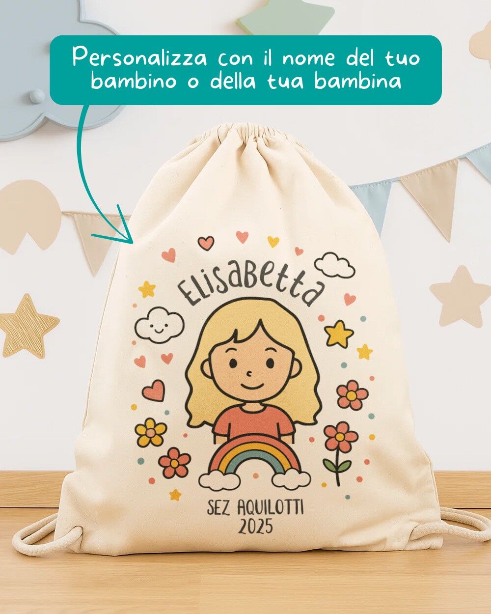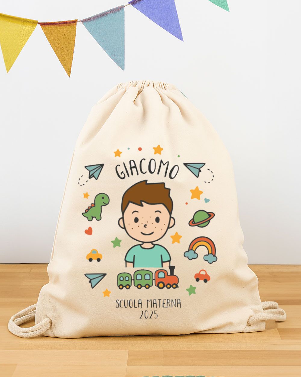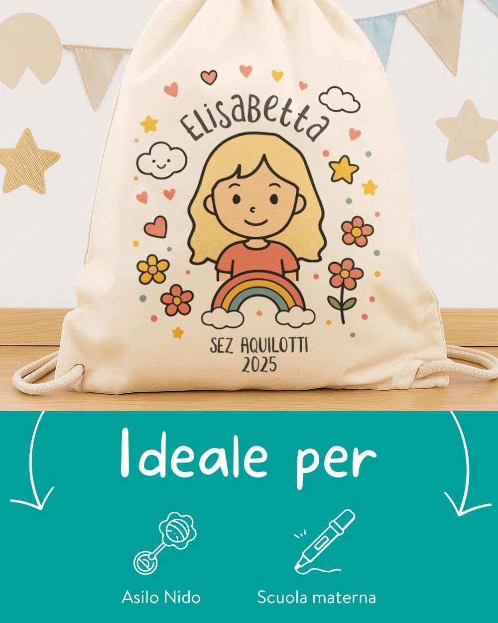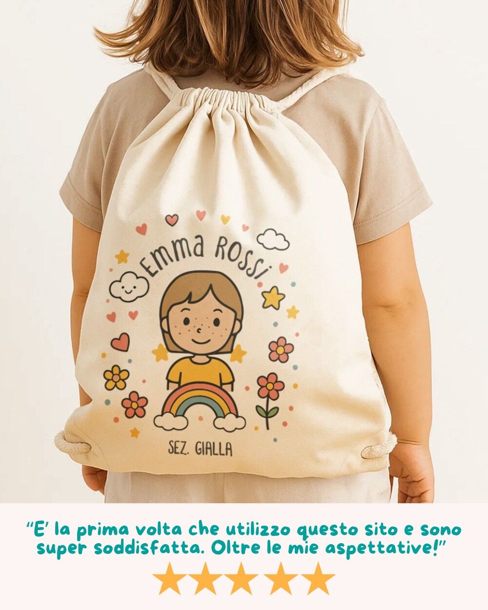 Durante l’ordine, potrai inserire il nome del bambino da stampare sulla sacca e scegliere ogni dettaglio del ritratto stilizzato, per un risultato davvero su misura.