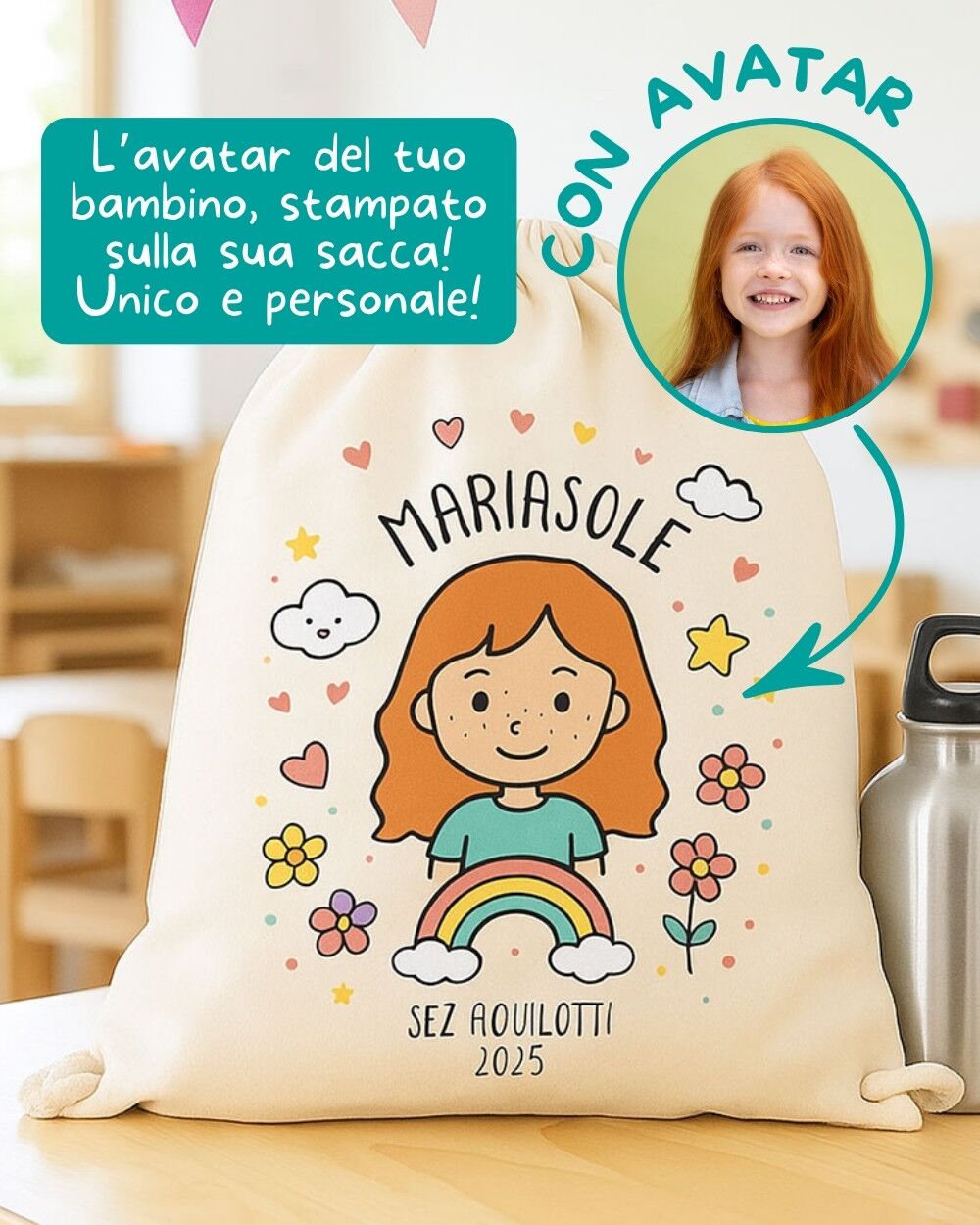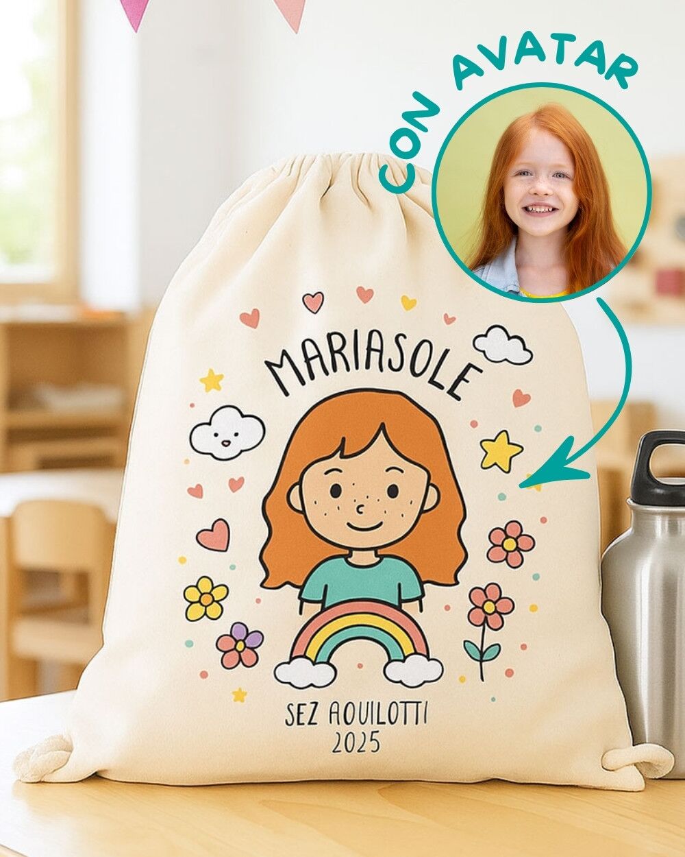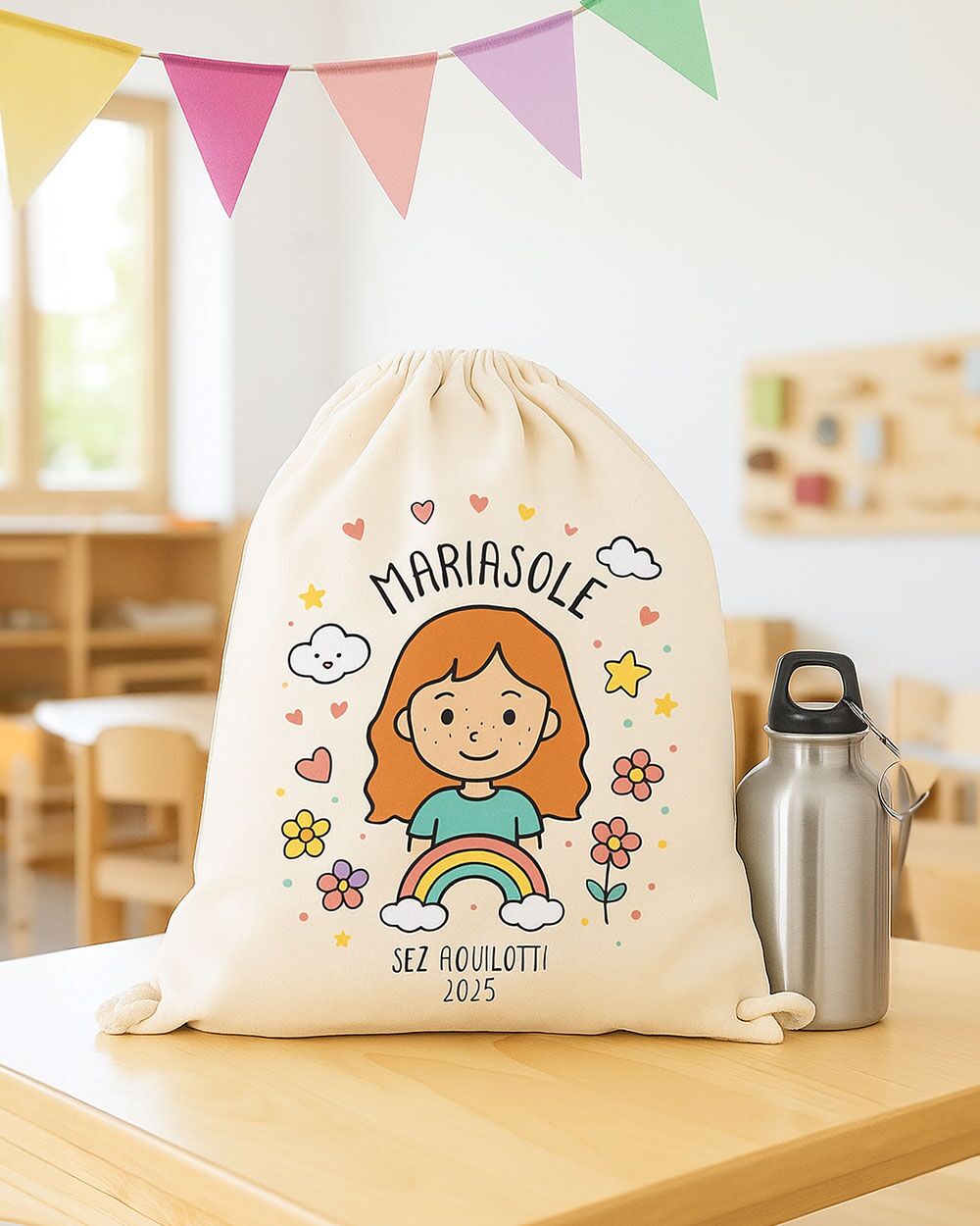 Questa sacca scuola con lacci personalizzata con nome e ritratto è pensata per accompagnare i bambini nelle loro prime esperienze scolastiche con uno stile unico e riconoscibile.