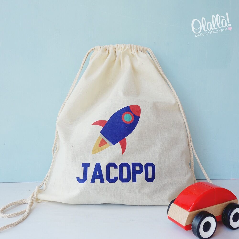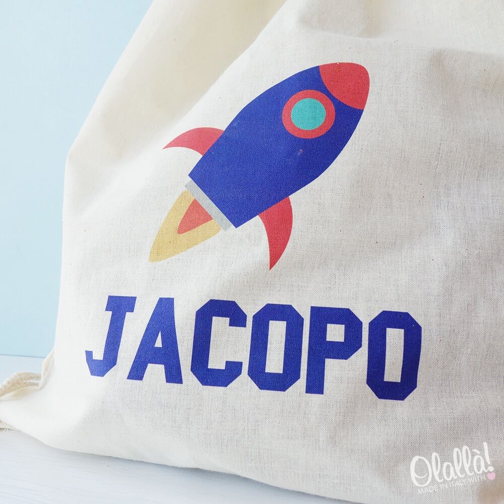 Borsa zainetto da scuola materna, adatta anche per le scarpine da ginnastica o altro materiale scolastico o sportivo. Cotone 100%. Tessuto spesso 140 gr.