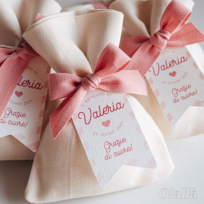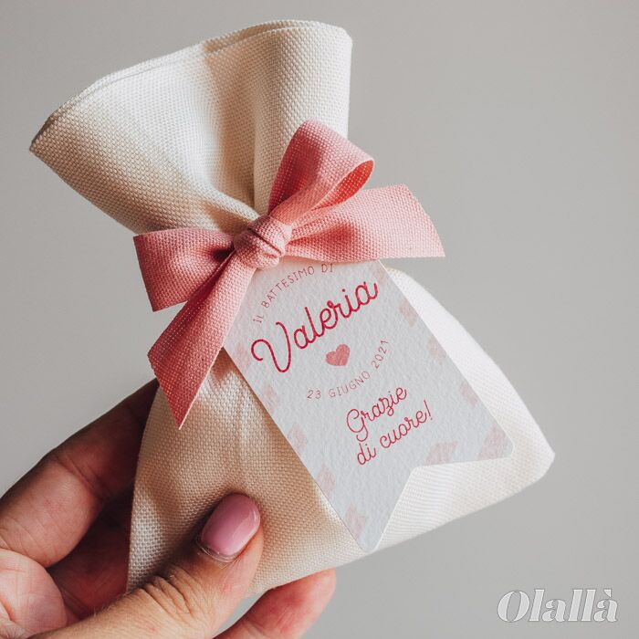 Delizioso sacchettino portaconfetti in cotone realizzato interamente in Italia con etichetta decorata e data del vostro evento. Un ricordo dolce e simpatico del battesimo, nascita o del primo compleanno del tuo bambino da donare ad amici, parenti e tutte le persone che ami.