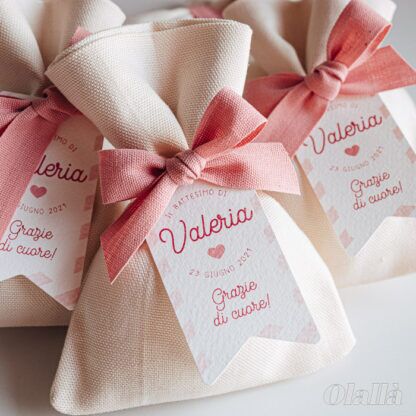 ULTERIORI INFORMAZIONI Il sacchettino è disponibile in vari colori a scelta, così come il nastro in cotone di alta qualità made in Italy con cui viene chiuso. L’etichetta in cartoncino pregiato misura 5 x 3 cm. Dopo l’acquisto riceverai una email con la bozza di stampa dell’etichetta, in modo che tu la possa verificare prima del realizzo.