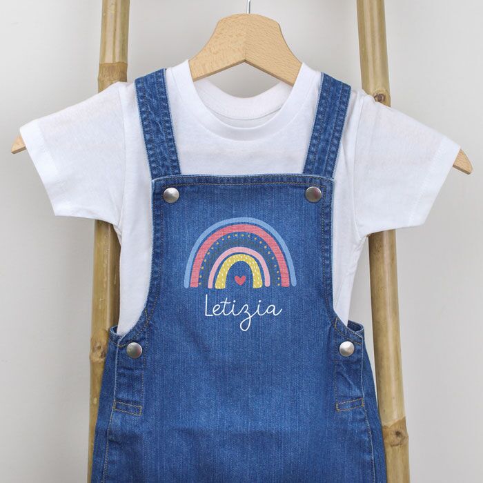 Salopette personalizzata con il nome e il disegno di un dolce arcobaleno. Il disegno non è personalizzabile.