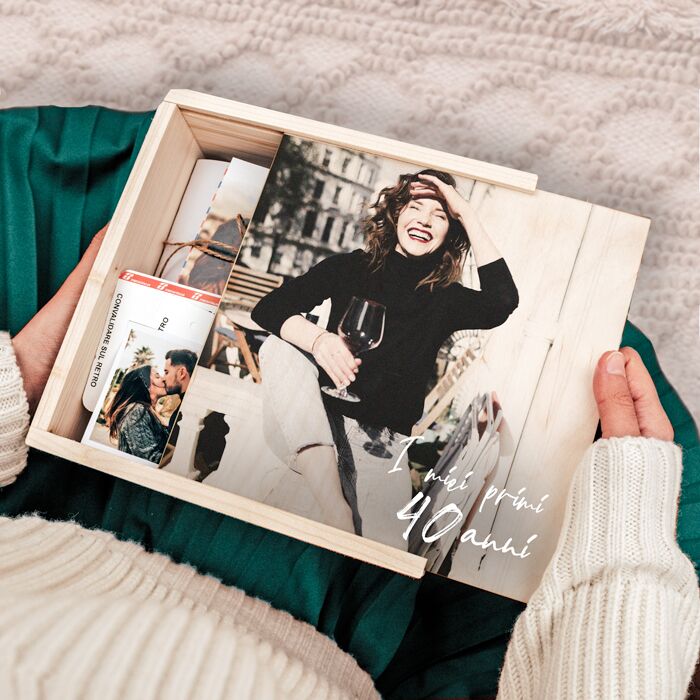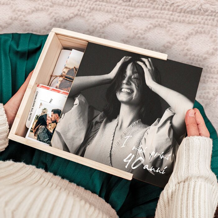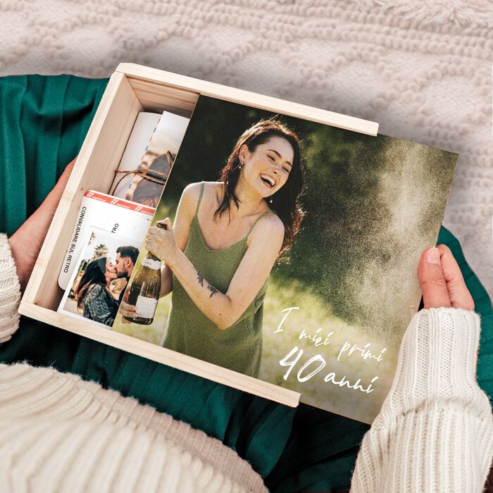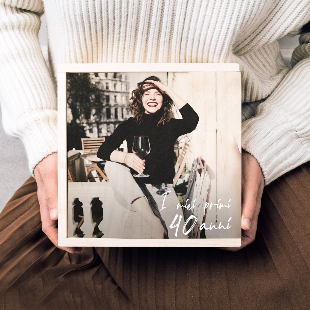 Scatola Personalizzabile Box Ricordi “I miei primi 40 anni”. Raccogli i ricordi più belli dei tuoi primi 40 anni in questa stupenda scatola in legno, personalizzabile con la foto della festeggiata e una breve frase. Biglietti d’auguri, del treno, di quel fantastico concerto in spiaggia…e poi foto, lettere e molto altro: crea una “capsula del tempo” per l’amica che compie 40 anni quest’anno e stupiscila con un regalo che punta dritto al cuore!