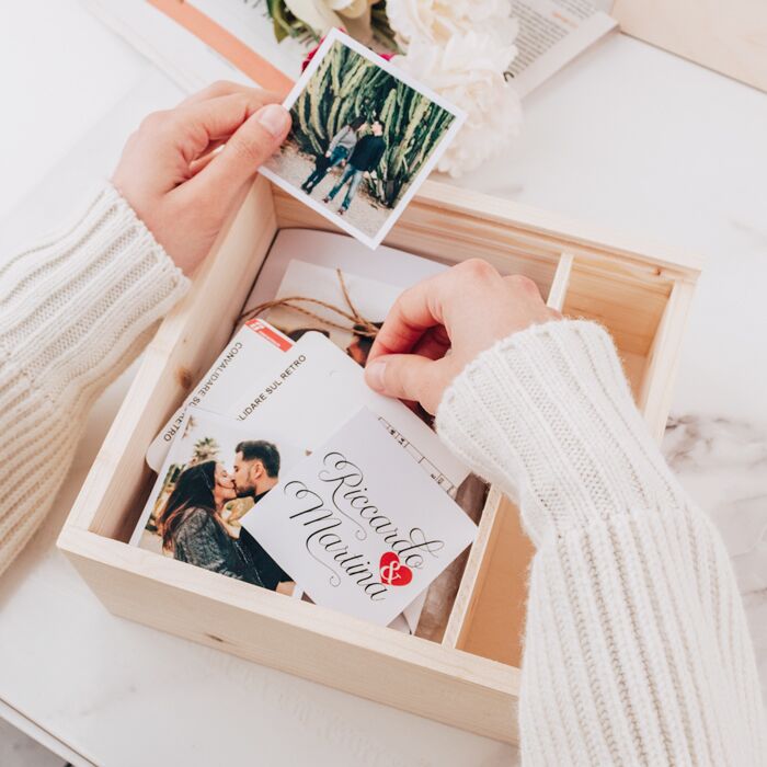 Il coperchio della scatola è personalizzabile con una foto e una breve frase. È possibile inserire uno scomparto interno in legno.
