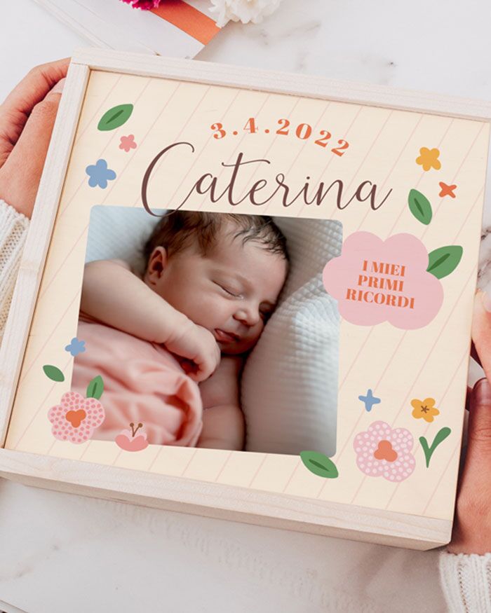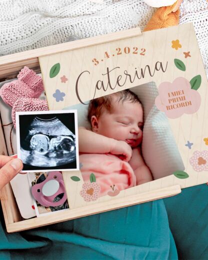Il coperchio della scatola è personalizzabile con una foto e con il nome della neonata. È possibile inserire uno scomparto interno in legno.