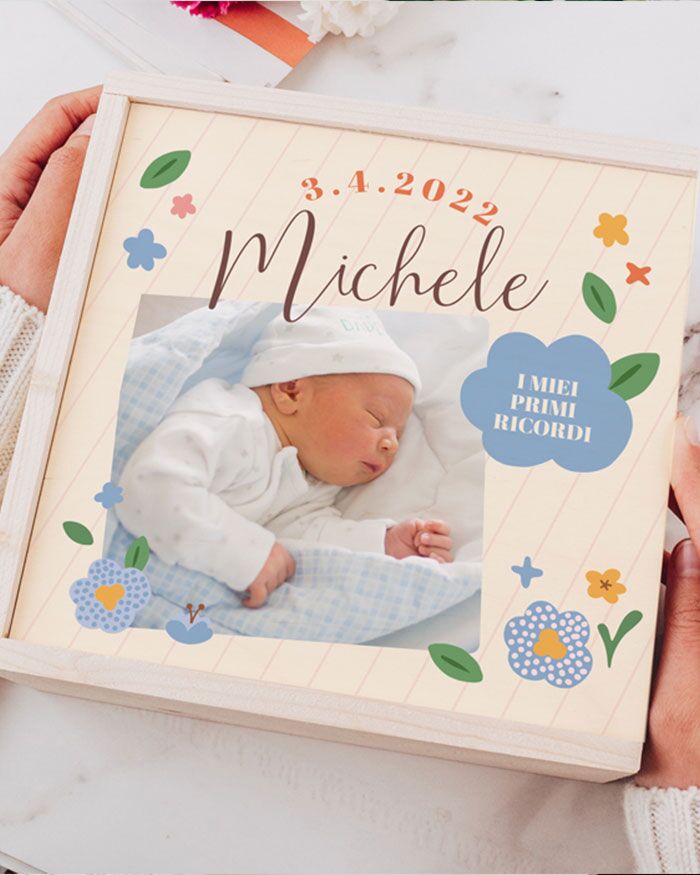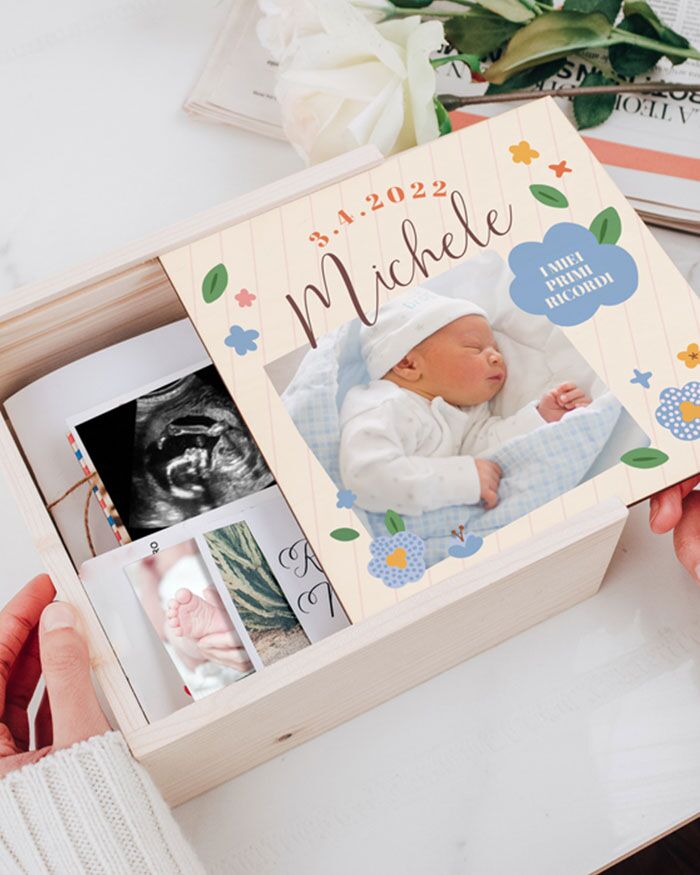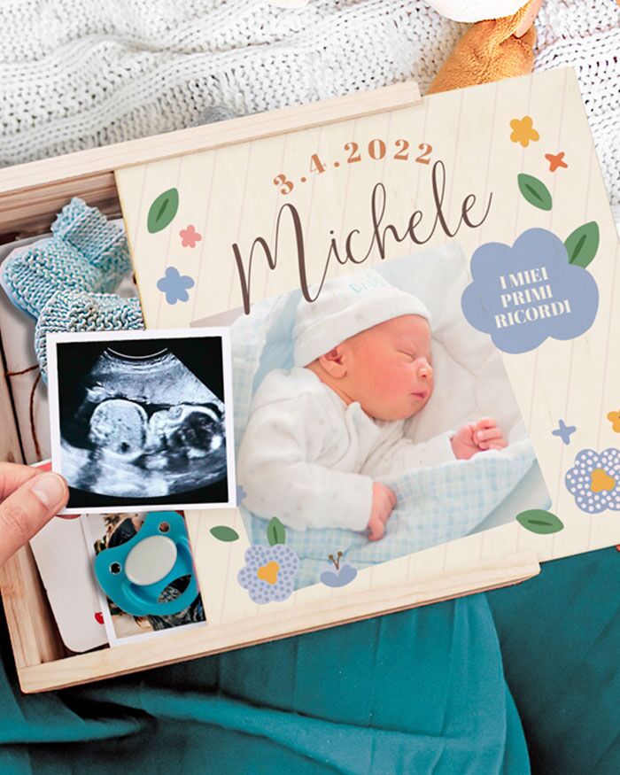 Stupenda scatola memory box dei ricordi per raccogliere tutti i migliori momenti del maschietto appena arrivato in città. Con questa stupenda scatola in legno potrai conservare tutti i momenti più belli della gravidanza e dei suoi primi mesi. La scatola è personalizzabile con una foto e una dedica sul coperchio. Puoi metterci dentro di tutto, le prime scarpine, la prima ecografia, i primi momenti passati assieme…Tutti questi ricordi potranno essere raccolti dentro questa “capsula del tempo” che i genitori possono comporre insieme per creare un ricordo indelebile del neo arrivato.