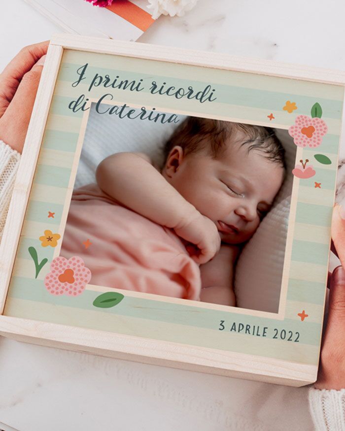 Il coperchio della scatola è personalizzabile con una foto e con una dedica con il nome della neonata. È possibile inserire uno scomparto interno in legno.