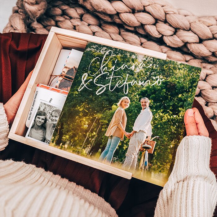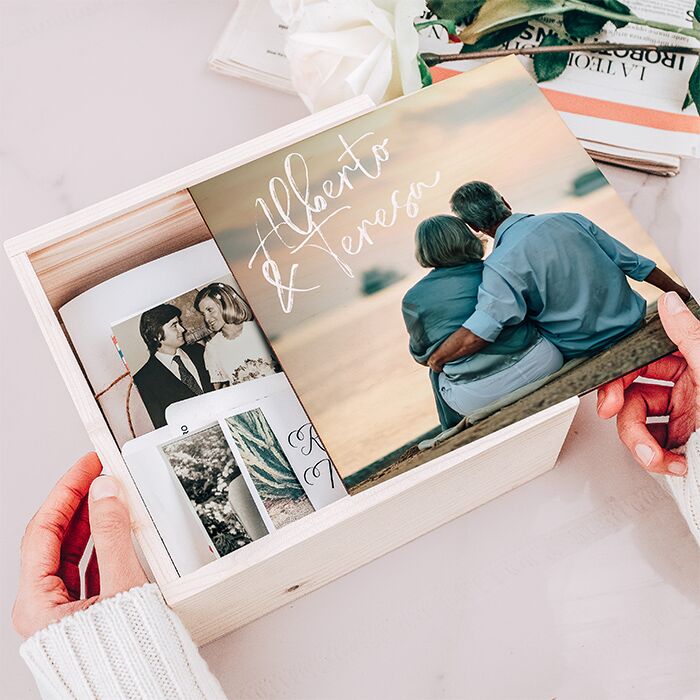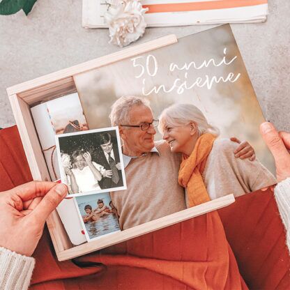Scatola Personalizzabile Box Ricordi per un perfetto regalo d’anniversario. Raccogli i ricordi più belli di una storia d’amore lunga tutta la vita e conservali in questa stupenda scatola in legno, personalizzabile con la vostra foto e una breve dedica. Le vecchie foto delle vacanze, i primi scatti con i bimbi, i biglietti dei concerti e tutto quello che ha un valore affettivo: tutto andrà a ricreare una sorta di “capsula del tempo” che stupirà tuo marito o perché no, anche i tuoi genitori in occasione del loro anniversario!