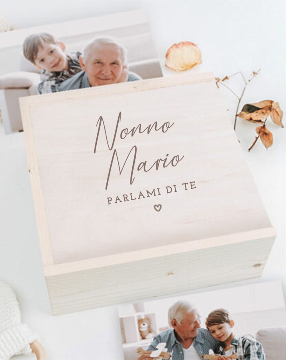 Dolcissima Scatola dei Ricordi o Memory Box personalizzabile con la scritta “Nonno Parlami di te”. Per la prossima Festa dei Nonni regala un’emozione al tuo nonno del cuore con questa scatola in legno inciso, che potrai riempire con le vostre foto, i libri di ricette e i tanti ricordi che vi legano. Siamo sicuri che al nonno scenderà una lacrimuccia vedendola!