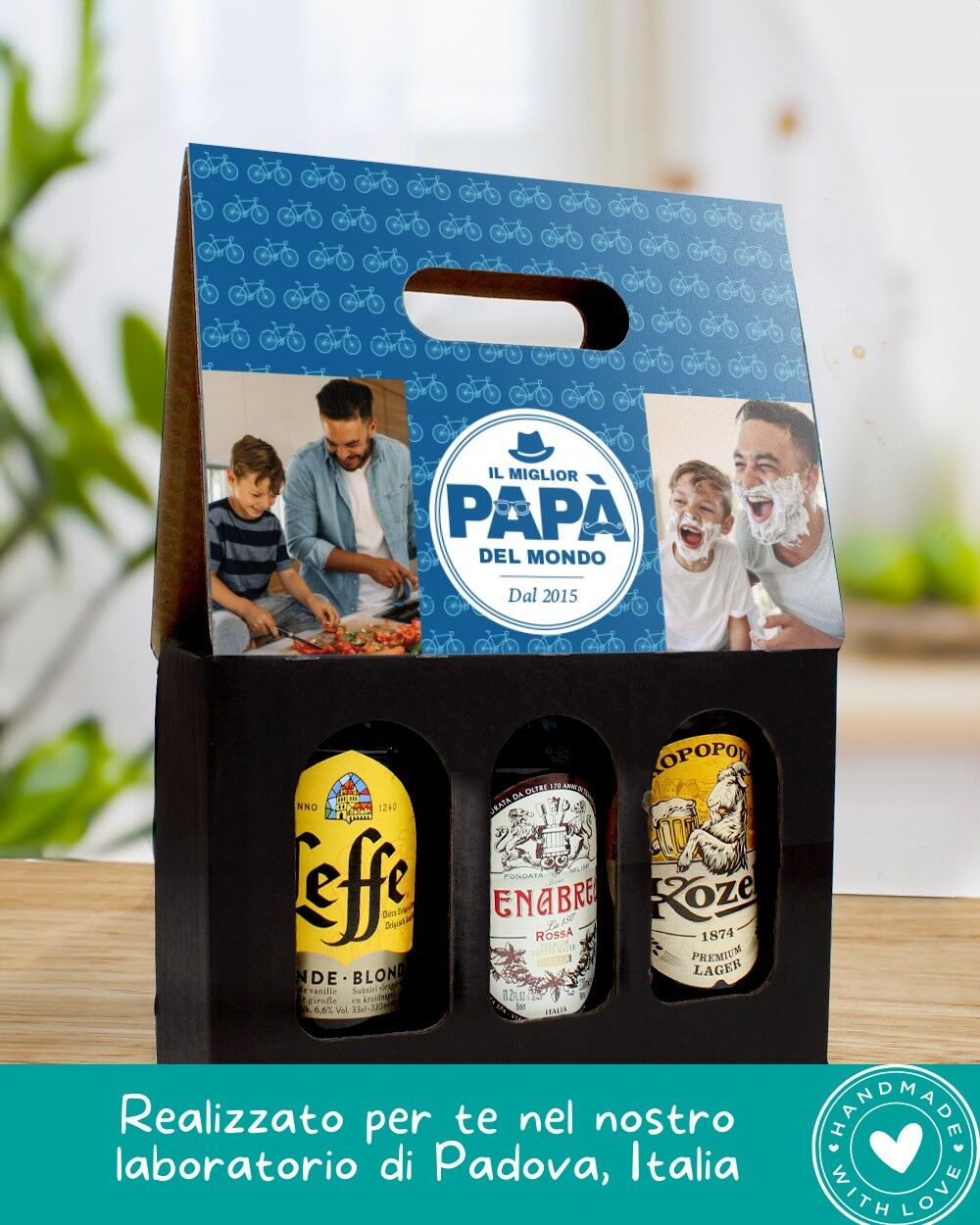 La scatola portabirre è stata pensata per contenere 3 bottiglie di birra da 33 cl. Puoi personalizzare la confezione scegliendo tra le quattro fantasie proposte e caricando le tue foto. La dicitura “Il miglior papà del mondo” rimane standard; è possibile personalizzare solo l’anno (es. Dal 2015).