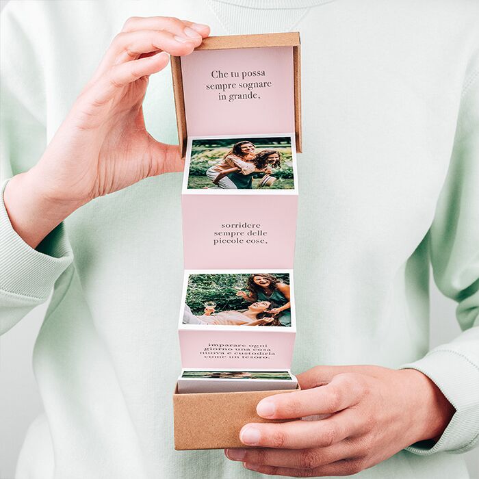 Una piccola scatola in grado di regalare grandi emozioni: stupisci la tua amica del cuore con questa box dei ricordi personalizzabile con foto e frasi tenere. Ti basterà inserire le foto e le frasi e in pochi giorni la magica scatolina arriverà direttamente a casa tua o anche alla destinataria, ovunque essa si trovi!