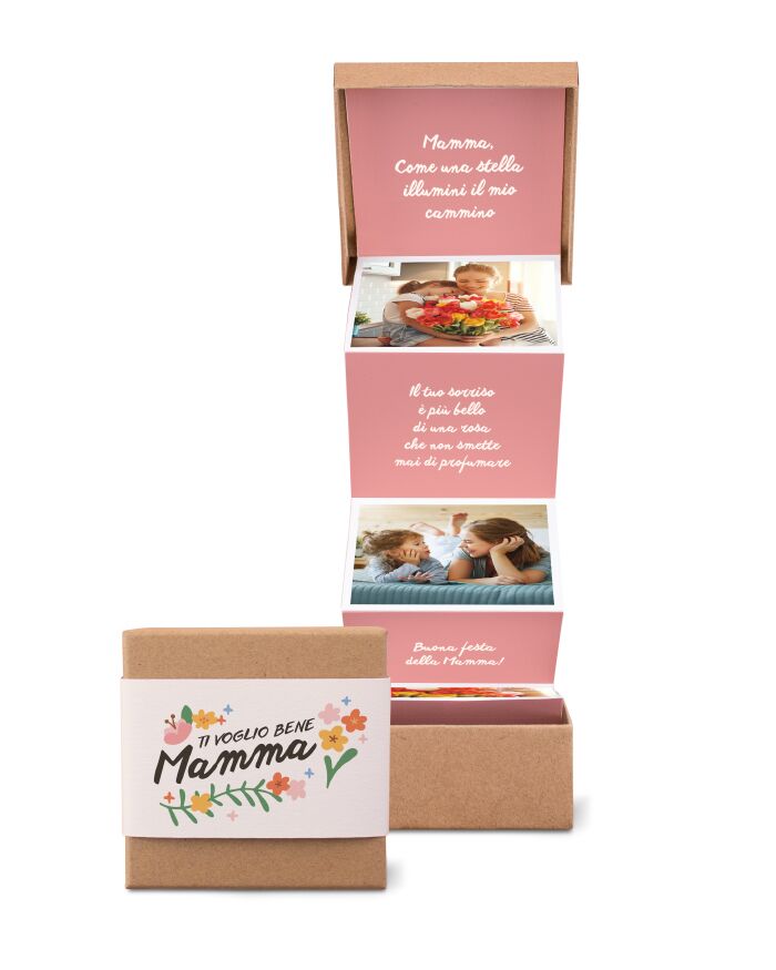 Questa dolcissima explosion box è una piccola scatola in grado di regalare grandi emozioni: stupisci la tua mamma con questa box dei ricordi personalizzabile con foto e frasi tenere. Ti basterà inserire le foto e le frasi e in pochi giorni la magica scatolina arriverà direttamente a casa tua o anche alla destinataria, ovunque essa si trovi!