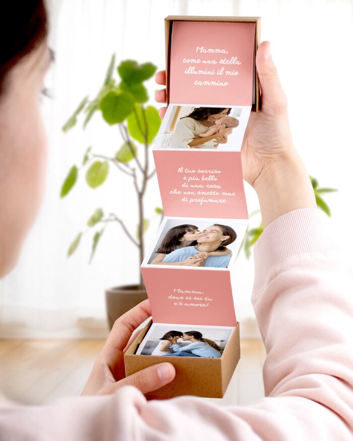 - PERSONALIZZA LA TUA EXPLOSION BOX con le vostre foto del cuore e 4 brevi frasi che esprimano l’amore che provi per la tua mamma! Segui le indicazioni contenute nella infografica ed eccola pronta. La tua mamma non potrà che rimanere di stucco di fronte a questa magica scatolina dei ricordi!