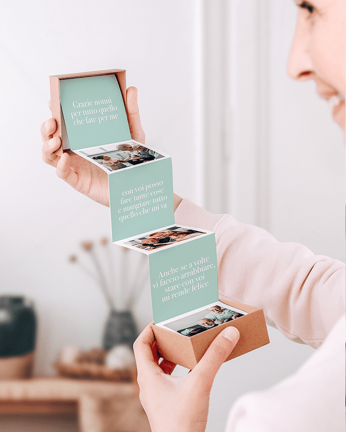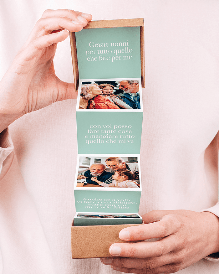 Una piccola scatola in grado di regalare grandi emozioni: stupisci i tuoi nonni del cuore con questa box dei ricordi personalizzabile con foto e frasi romantiche. Ti basterà inserire le foto e le frasi e in pochi giorni la magica scatolina arriverà direttamente a casa tua!