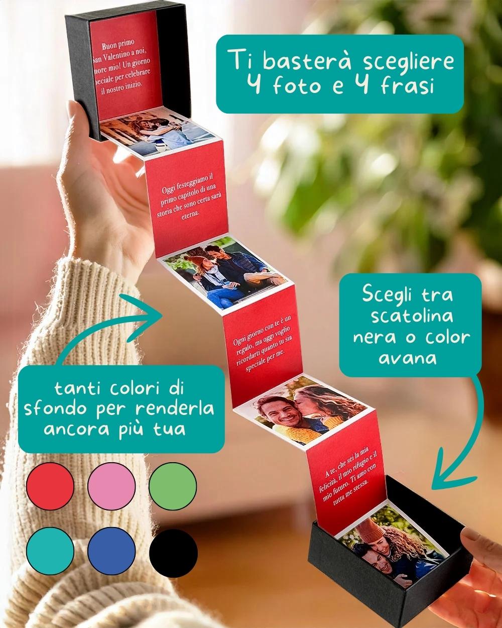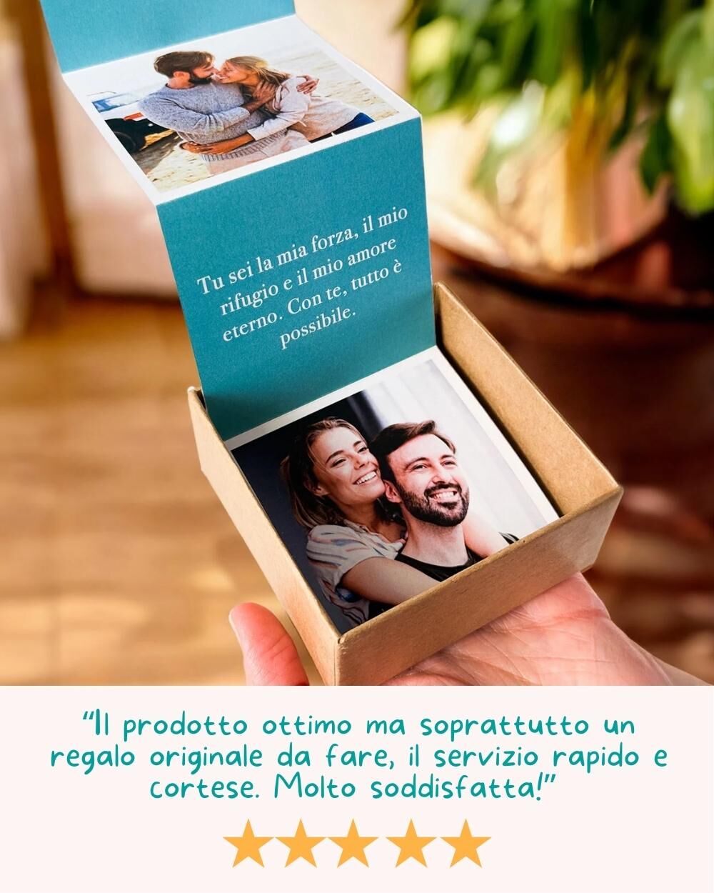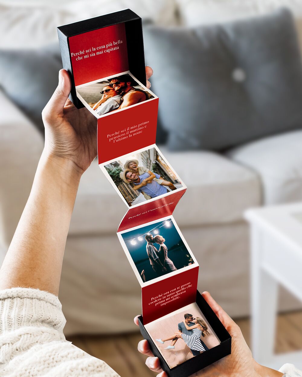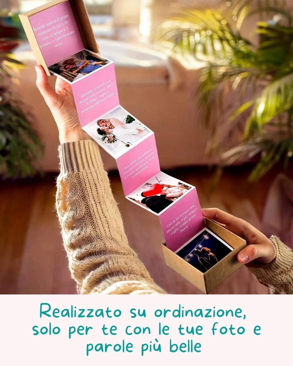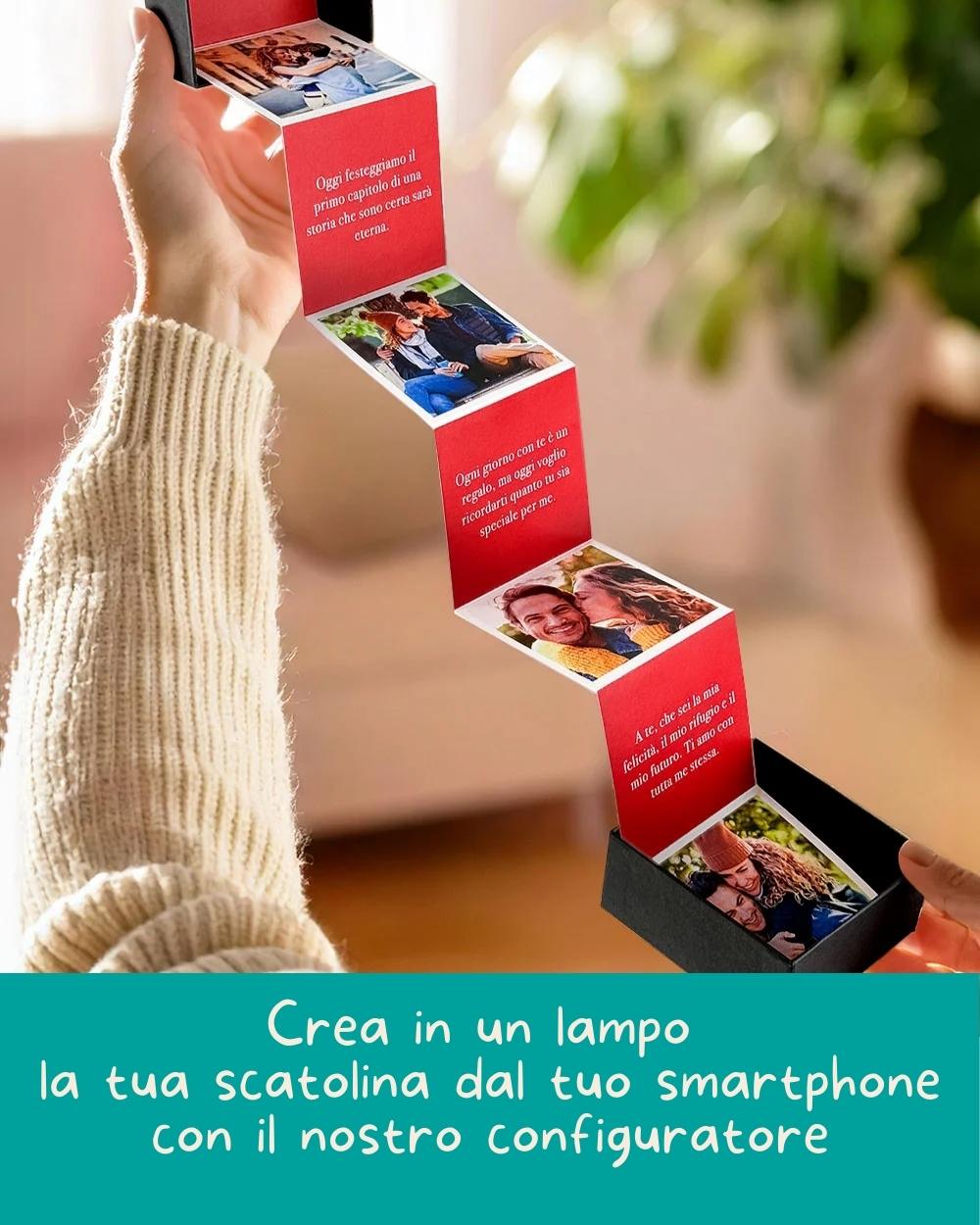 - Un dono che parla di voi: Ogni scatolina con foto pop-up racchiude i vostri momenti più belli, trasformandoli in un oggetto speciale.