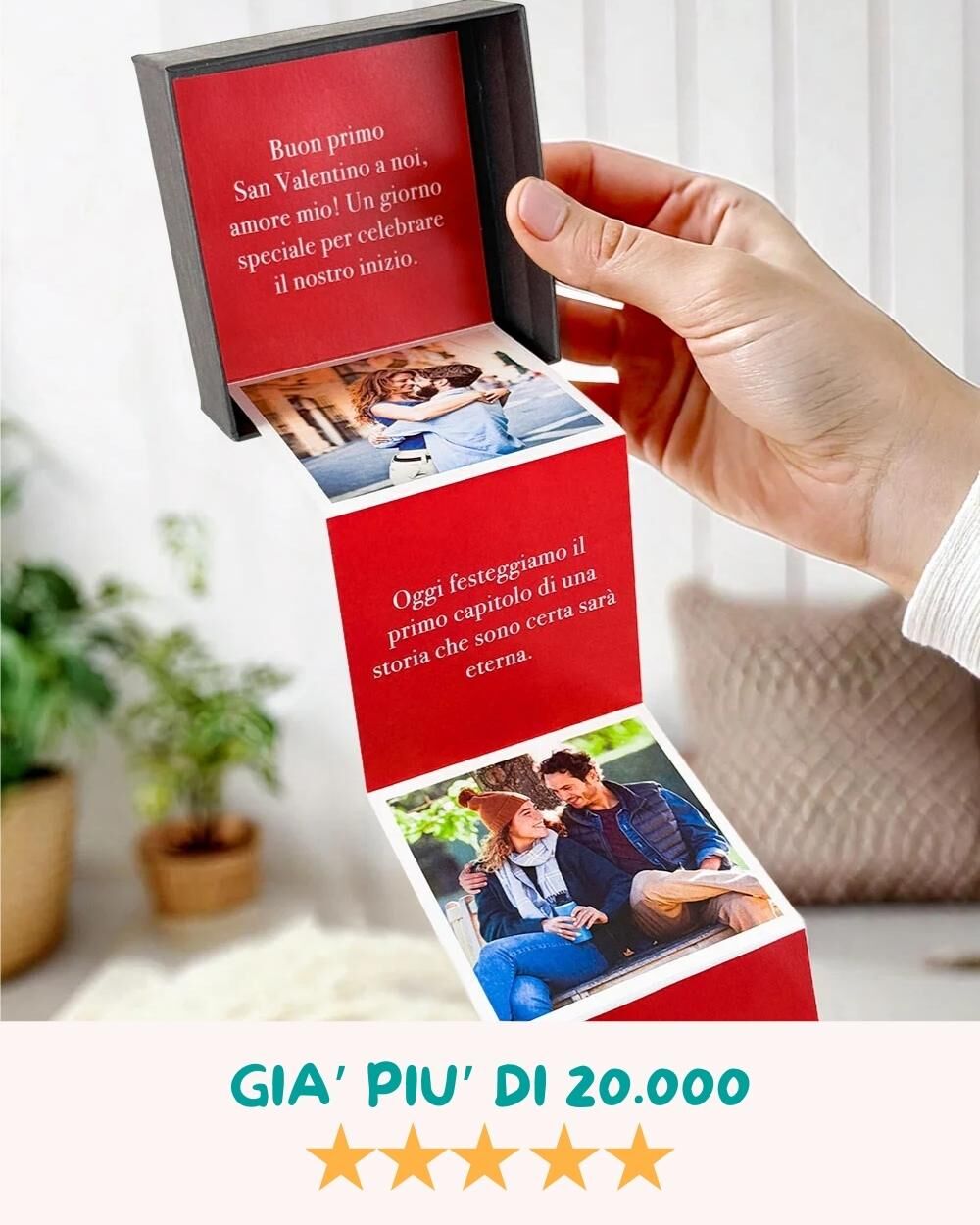 Sorprendi la persona che ami con un regalo unico ed emozionante: la nostra scatolina pop-up personalizzata è pensata per creare un momento indimenticabile. Ideale come regalo di San Valentino per lui o come regalo di San Valentino per lei, questa elegante scatolina con foto pop-up combina creatività e romanticismo in un oggetto che custodisce i ricordi più preziosi.