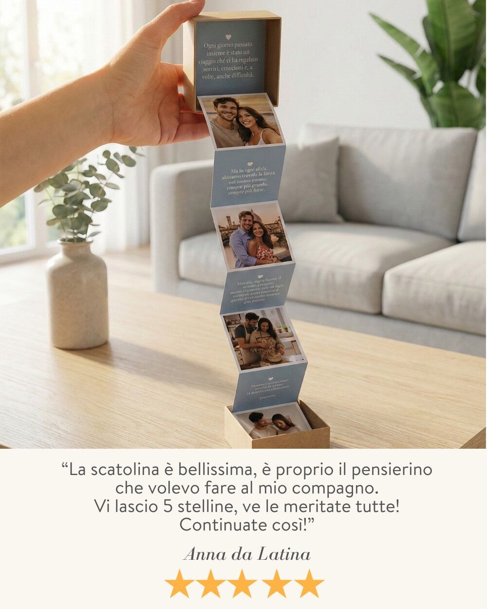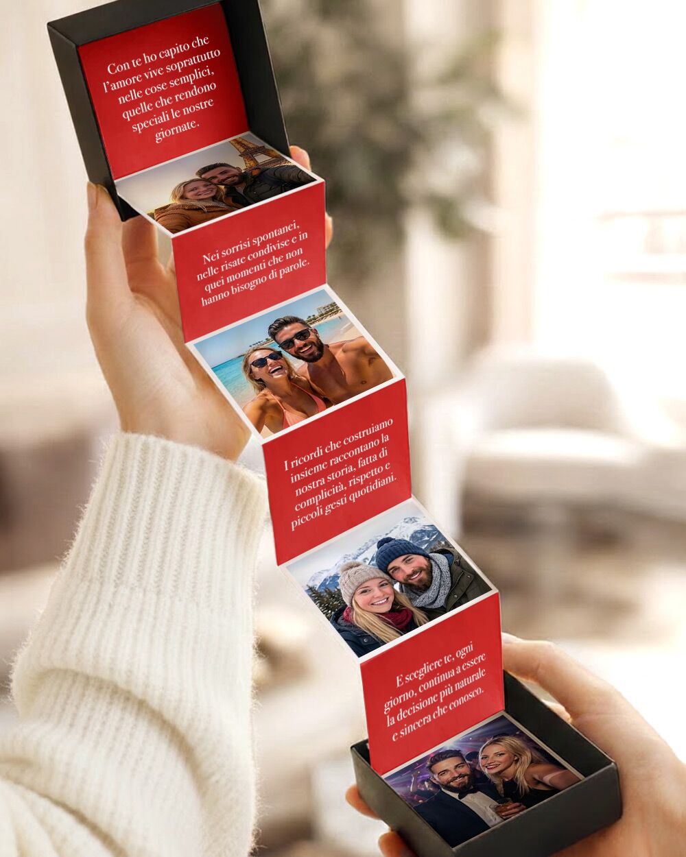 - Aggiungi dediche e frasi personalizzate: puoi scrivere fino a 4 frasi d’amore o dediche personali, che si alternano alle foto nella struttura a fisarmonica. Questo crea un effetto “racconto” quando la scatolina viene aperta, amplificando l’emozione del momento.