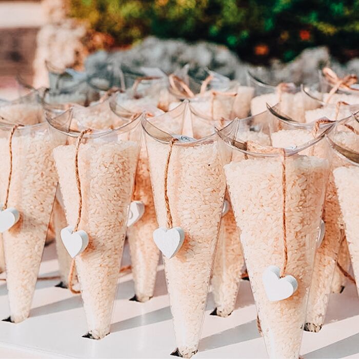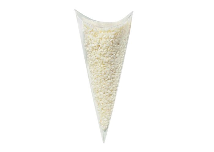 Set di 10 Scatole a forma di cono gelato trasparente in cartoncino, ideali per contenere in maniera originale il riso da lanciare agli sposi, ma anche confetti, caramelle o piccoli oggettini. Colore trasparente.