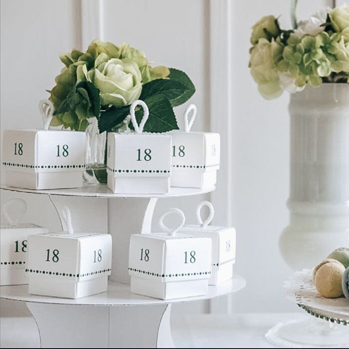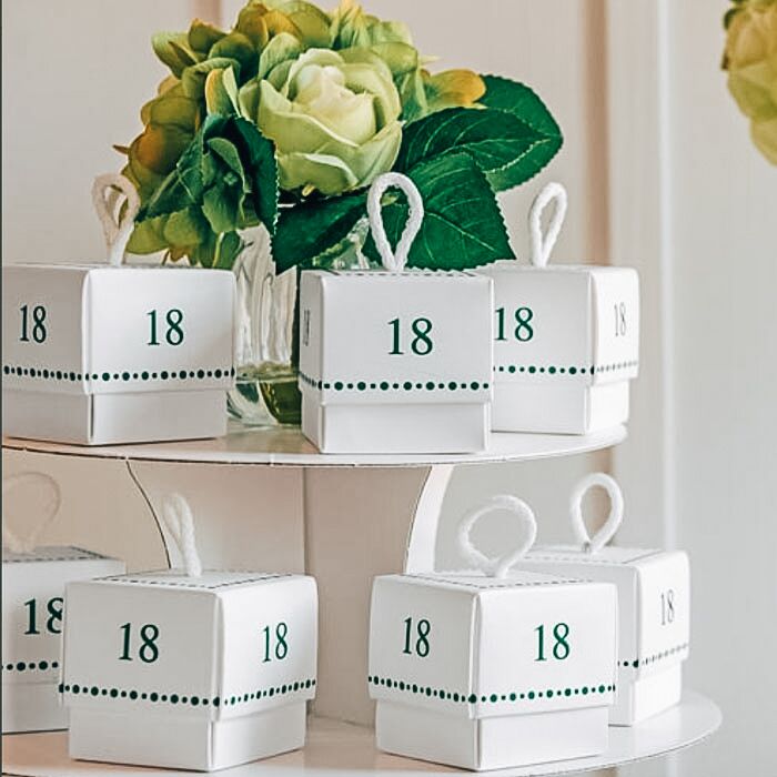 Set di 10 Scatoline in cartoncino color bianco e scritta “18”. Perfette per contenere confetti, praline o dolcetti. Ideali come bomboniera per il giorno del tuo diciottesimo compleanno per rendere felici tutti i tuoi invitati con questo splendido ricordo.