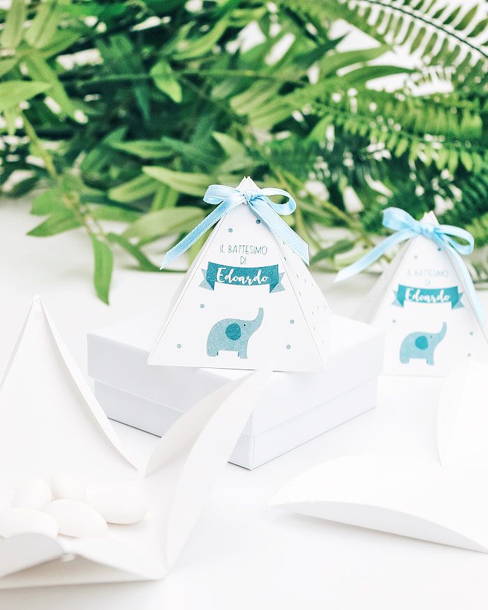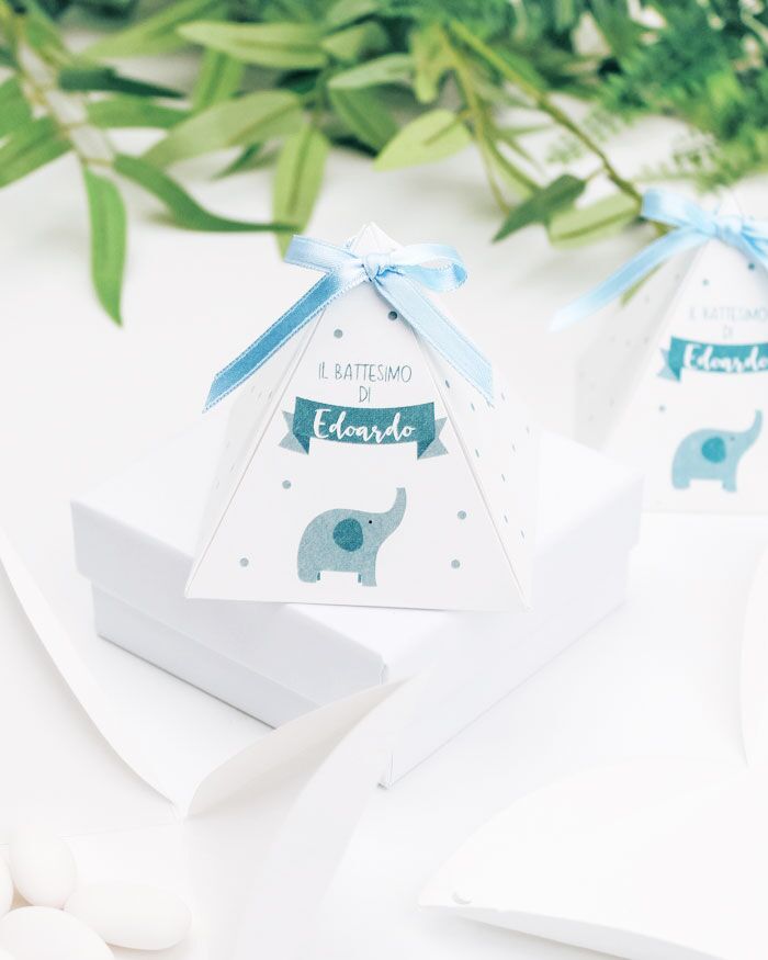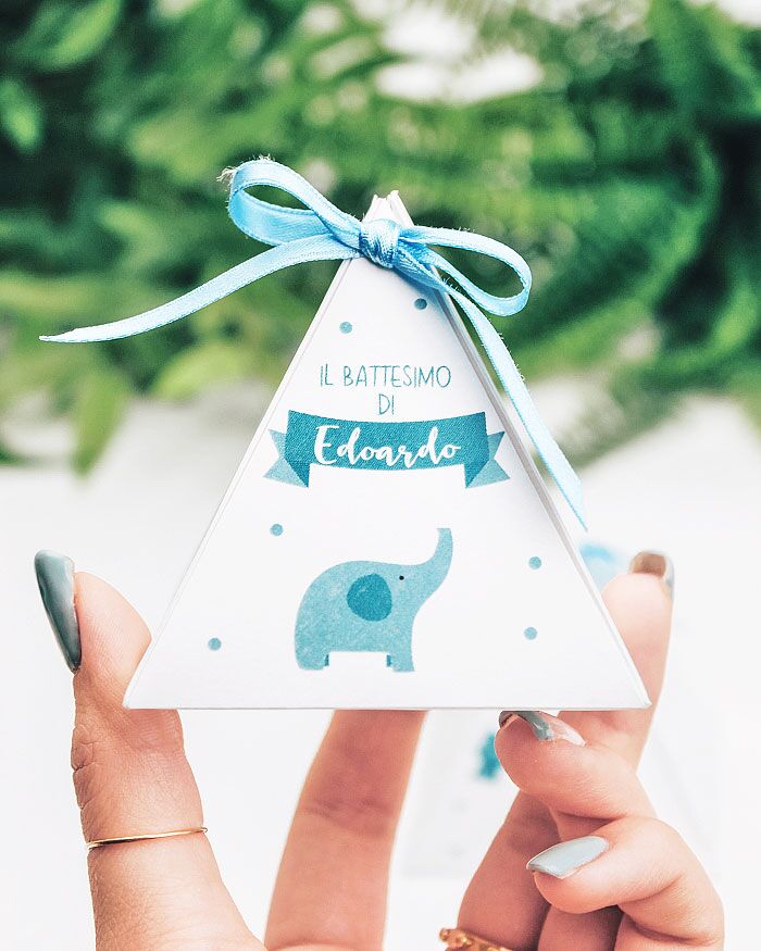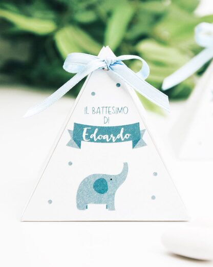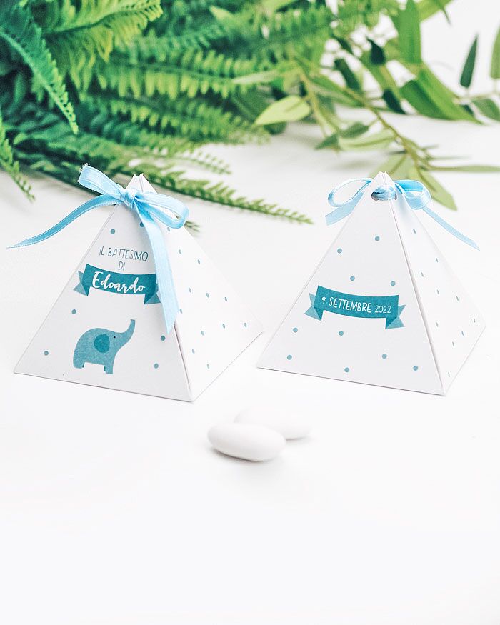 Stupenda bomboniera per il battesimo formata da una scatolina portaconfetti in cartoncino fai-da-te a forma di piramide personalizzabile con il nome del bimbo. Questa splendida scatolina decorata con un dolce elefantino sarà una bomboniera perfetta da consegnare a tutti gli invitati alla tua cerimonia, per festeggiare tutti assieme l’arrivo del nuovo bimbo in città. Le scatoline comprendono il nastrino in raso per chiuderle.