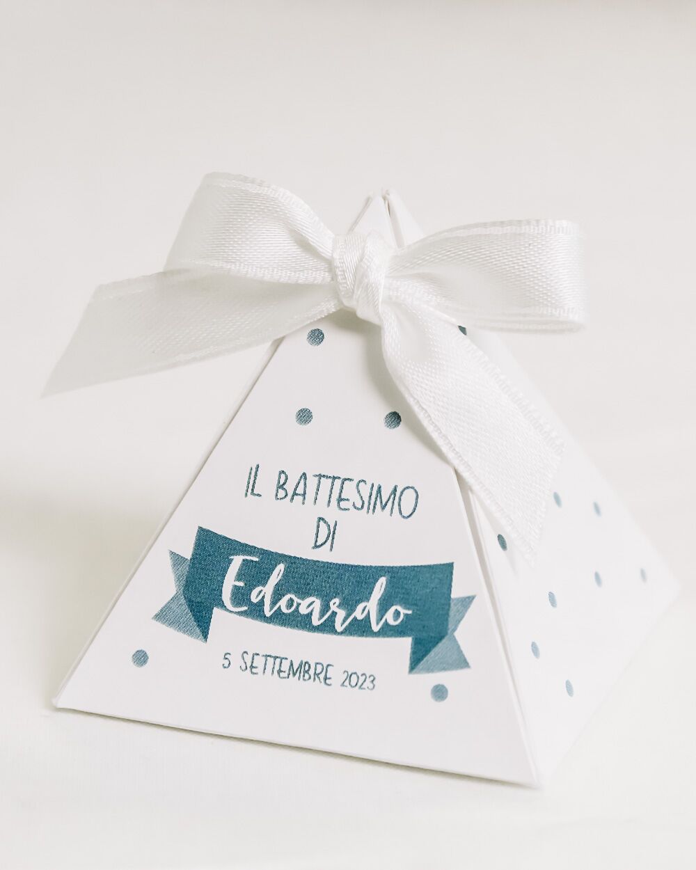 ULTERIORI INFORMAZIONI Scatoline di carta a forma di piramide fai-da-te ideali per contenere i confetti. È un’idea economica, ma al tempo stesso ricercata per realizzare le tue bomboniere fai-da-te per il battesimo del tuo bambino. Puoi personalizzare questa bomboniera per il battesimo con il nome del bimbo e con la data sul retro. Nel prezzo è incluso il nastrino di un colore a scelta tra quelli disponibili.