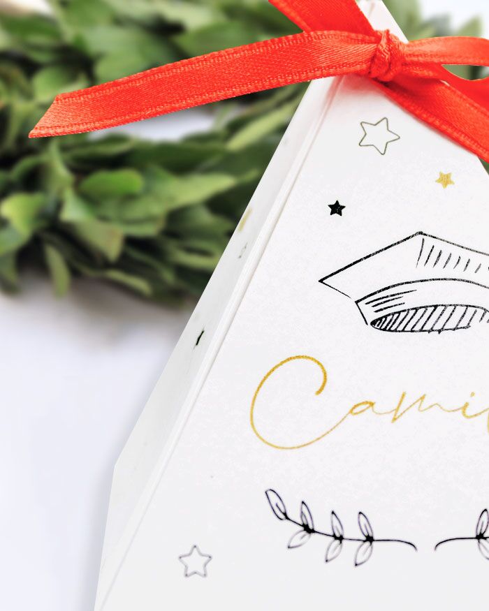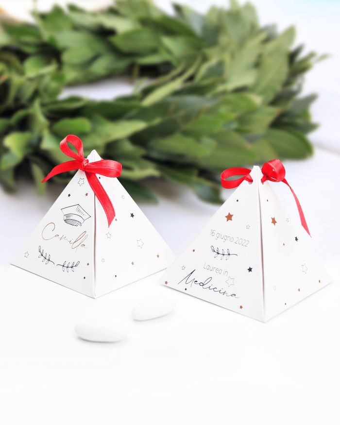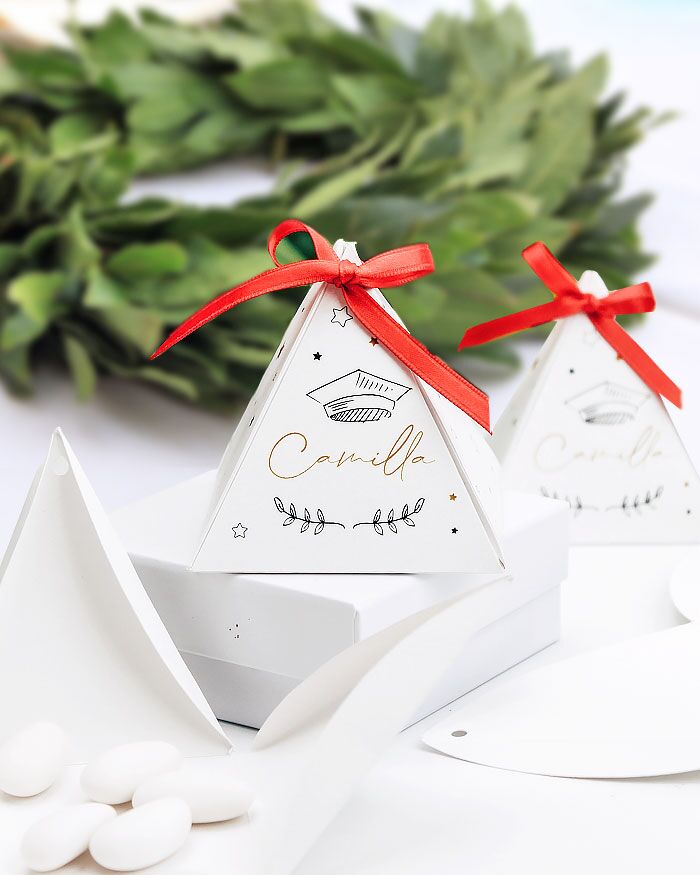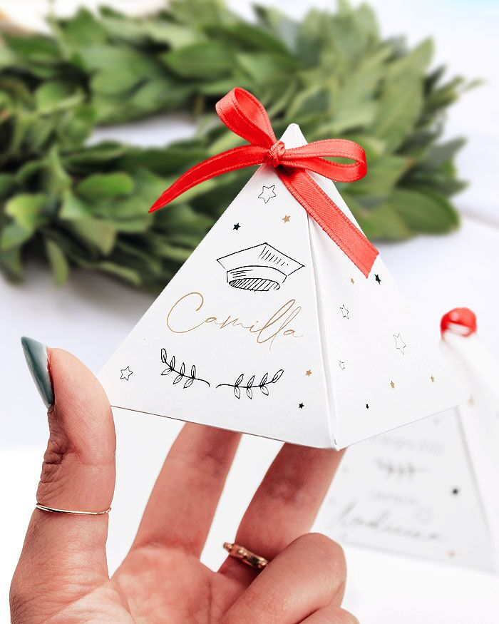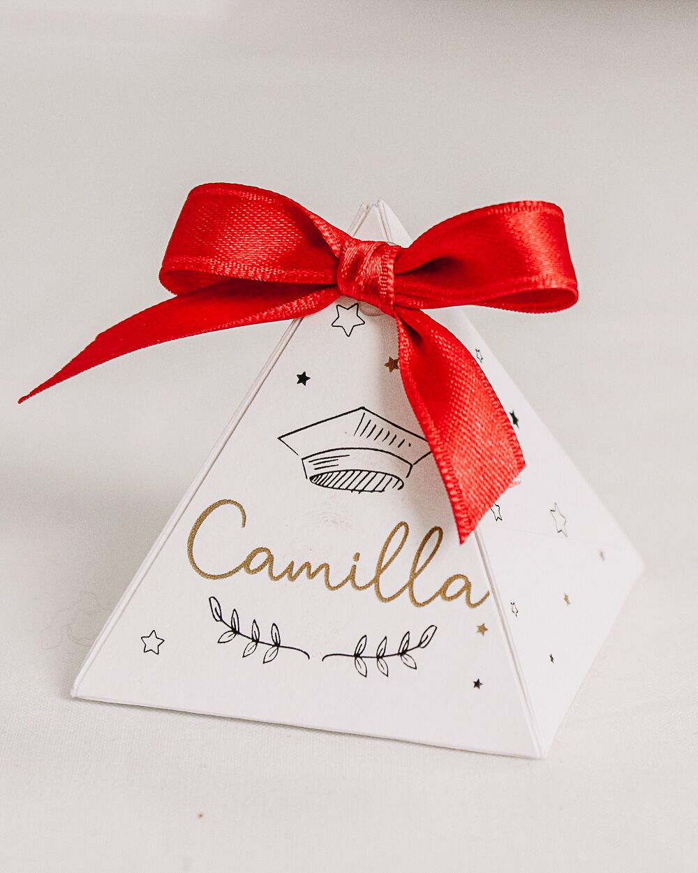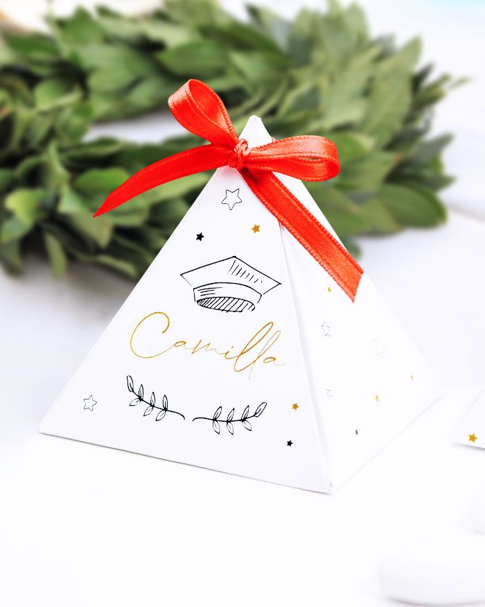 Bellissima bomboniera per la laurea composta da una scatolina portaconfetti in cartoncino fai-da-te a forma di piramide personalizzabile con il nome del laureato o laureata. Questa splendida scatolina sarà una bomboniera perfetta da consegnare a tutti gli invitati alla tua festa di laurea, per ringraziarli del supporto che ti hanno dato in questi anni. Le scatoline comprendono il nastrino in raso per chiuderle.