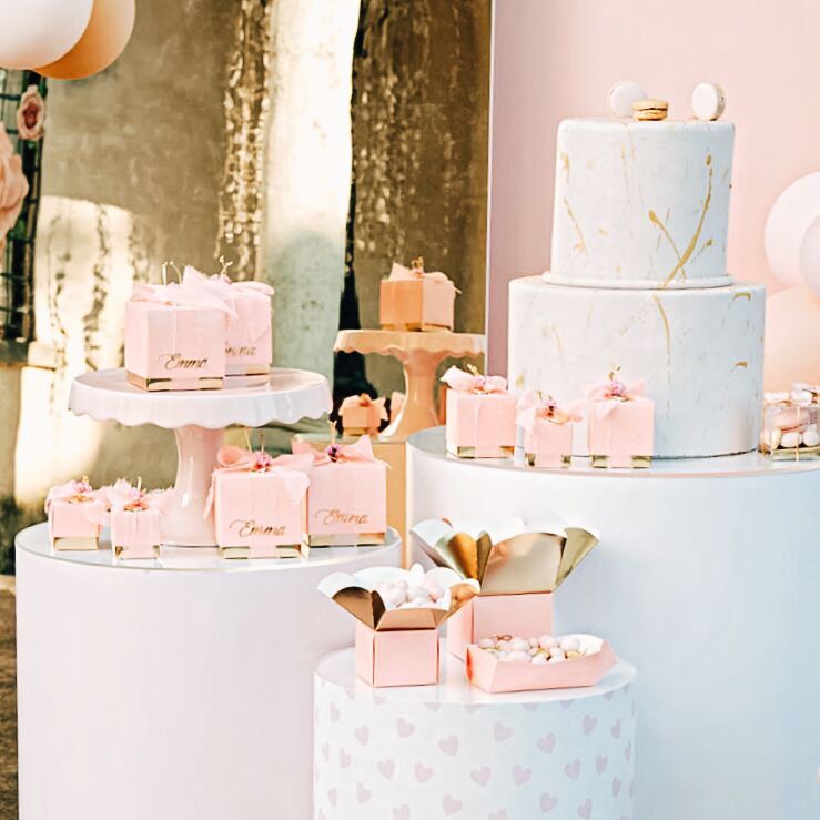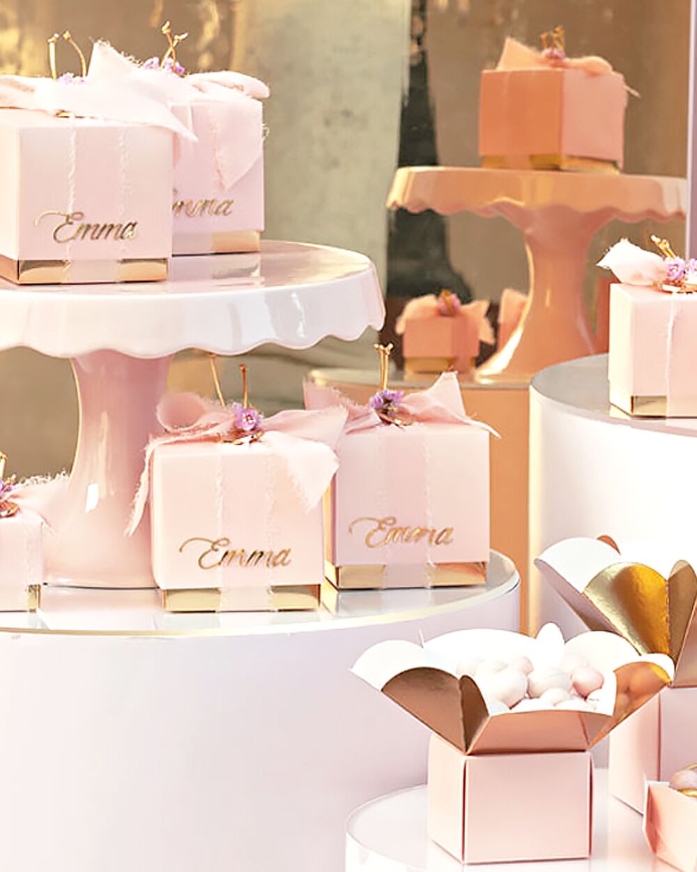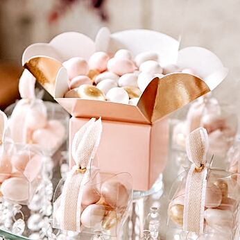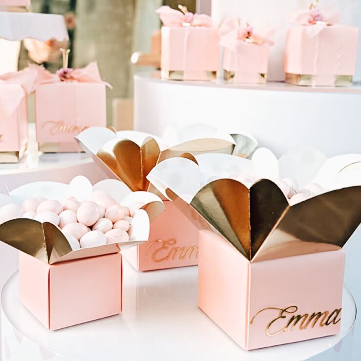 Set di 10 scatoline in cartoncino color rosa e oro, perfette per contenere confetti, praline o dolcetti. Ideali come bomboniera per il battesimo, per la comunione e per tutte le tue cerimonie. Sul sito disponibile in altre colorazioni.