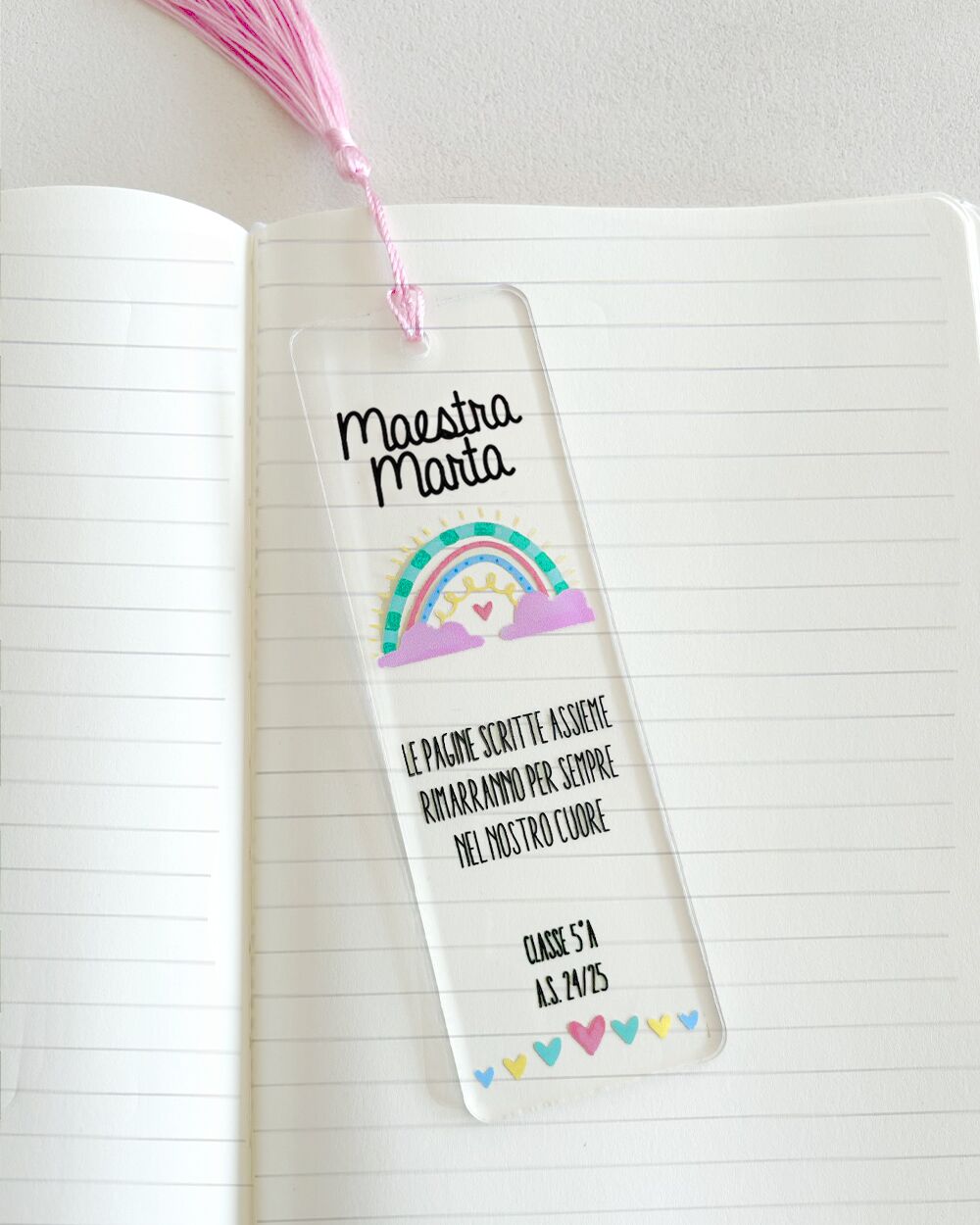 Cerchi un piccolo pensiero che parli al cuore? Questo segnalibro in plexiglas è il regalo perfetto per dire “Grazie maestra” con semplicità, colore ed emozione. Personalizzabile con nome, dedica, classe e anno scolastico, è un ricordo prezioso che accompagnerà ogni lettura con un sorriso. Questo segnalibro è più di un accessorio: è una carezza tra le pagine, un messaggio d’amore che resterà per sempre.