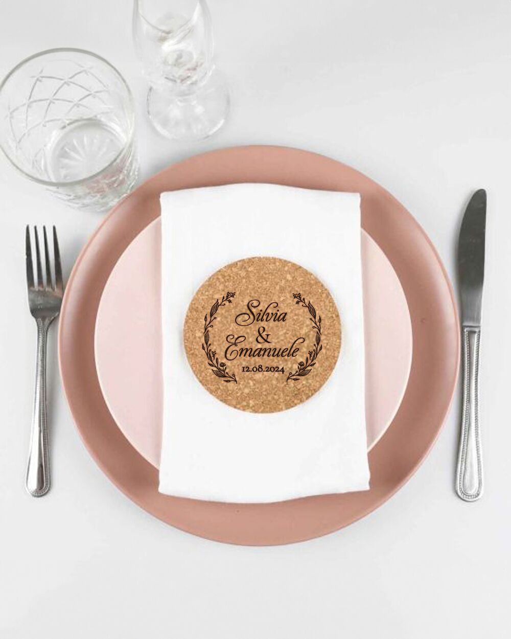 Segnaposto sottobicchieri in sughero con personalizzazione incisa a laser.
