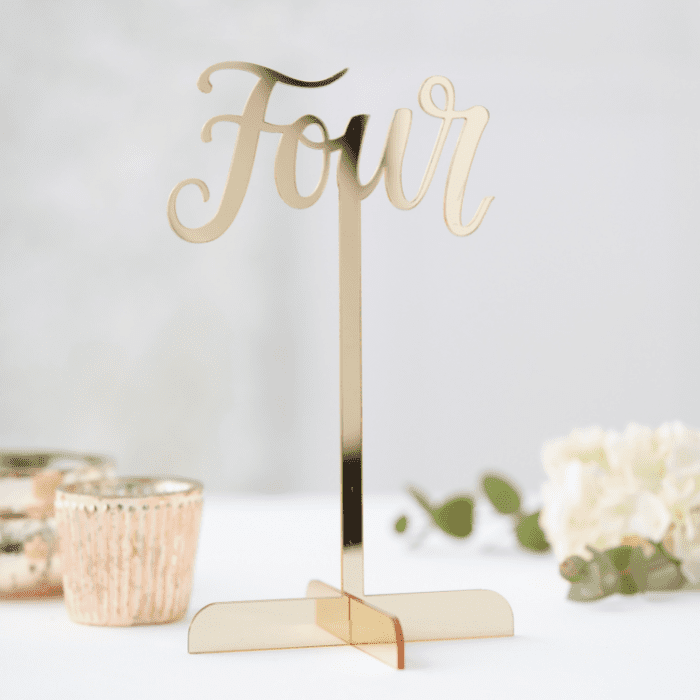 Con questi segnatavola color oro, i tuoi ospiti troveranno facilmente il proprio tavolo durante la tua cerimonia. Ogni numero è realizzato in acrilico e farà risaltare ogni tavolo nel tuo grande giorno grazie all’effetto dorato. Il tocco finale giusto per il matrimonio perfetto.