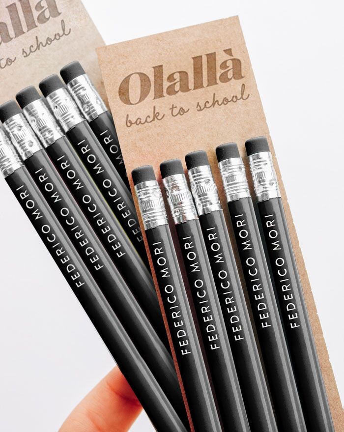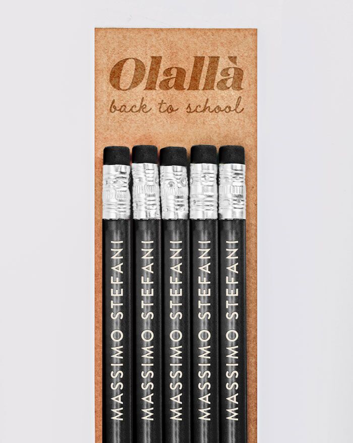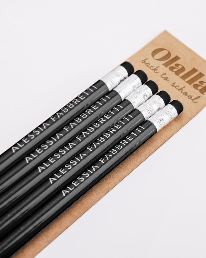 Set di 5 matite nere in grafite personalizzate con gommino, personalizzate con un nome o breve frase in bianco. Con queste matite personalizzate, prendere appunti, fare un disegno o un’operazione di matematica diventerà sicuramente un’esperienza unica! Un regalo simpatico e colorato da fare a tutti coloro che desiderano iniziare la scuola in perfetto stile.