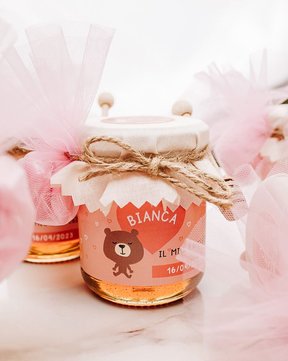 PERSONALIZZA Dolcissimi vasetti di miele personalizzati con un tenero orsetto ed il nome del bambino. Il copri vasetto in tessuto è decorato con un simpatico cuore con la scritta che preferisci e adornato da un nastrino di spago. Personalizza con la tua frase e data speciale. Puoi scegliere di riceverle a casa da confezionare autonomamente o di riceverle già pronte e perfette per essere subito disposte sul tavolo del tuo evento.