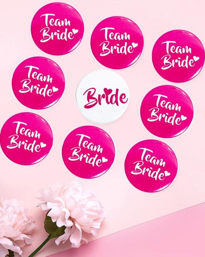 Il set comprende 7 spille: 6 in colore fucsia con scritta “Team Bride” e una in color bianco con scritta “Bride”.