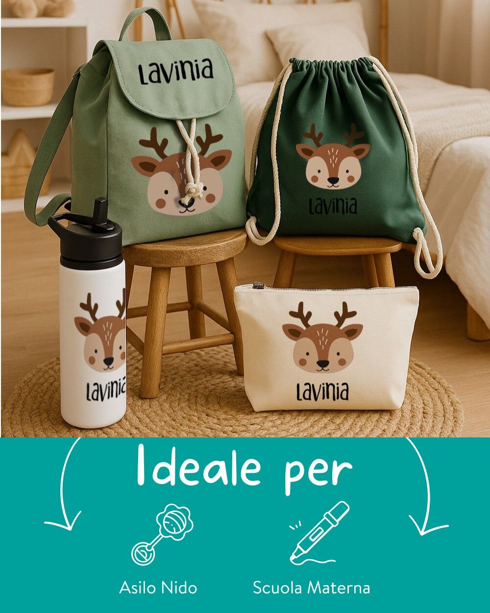 - È un dono pratico, ma anche emozionante: ogni elemento è pensato per accompagnare il bambino con affetto e riconoscibilità nel suo quotidiano scolastico.