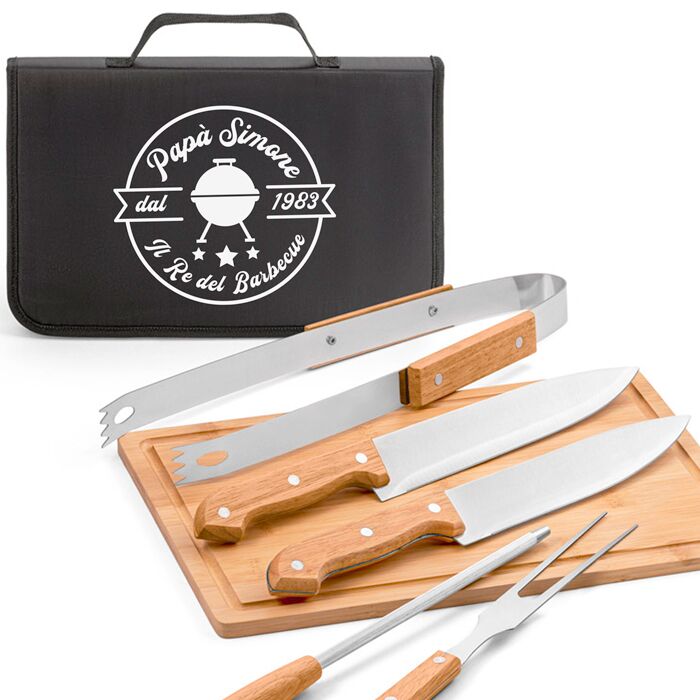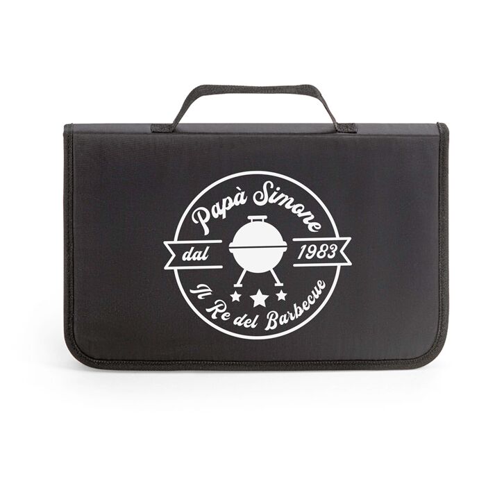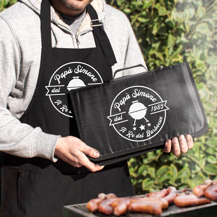Stupisci il tuo papà del cuore o un caro amico amante del barbecue con questo incredibile set personalizzato contenente tutto l’occorrente per il barbecue! Il destinatario di questo regalo sarà molto fiero della sua valigetta personalizzata, grazie alla quale potrà dare sfogo a pieno titolo alle sue abilità culinarie alla griglia!