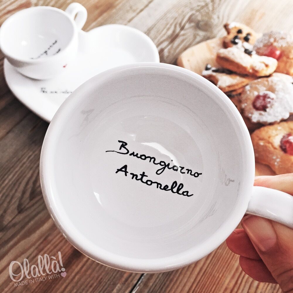 Portate una romantica colazione a letto al vostro lui o alla vostra lei augurandogli un dolce buongiorno con queste simpatiche tazze dipinte a mano con la vostra frase, nome o data del cuore. Sono una carinissima idea regalo da fare al vostro lui o alla vostra lei per San Valentino o l’anniversario o Natale, destinate a rendere ancora più speciali i vostri momenti di pausa caffè.