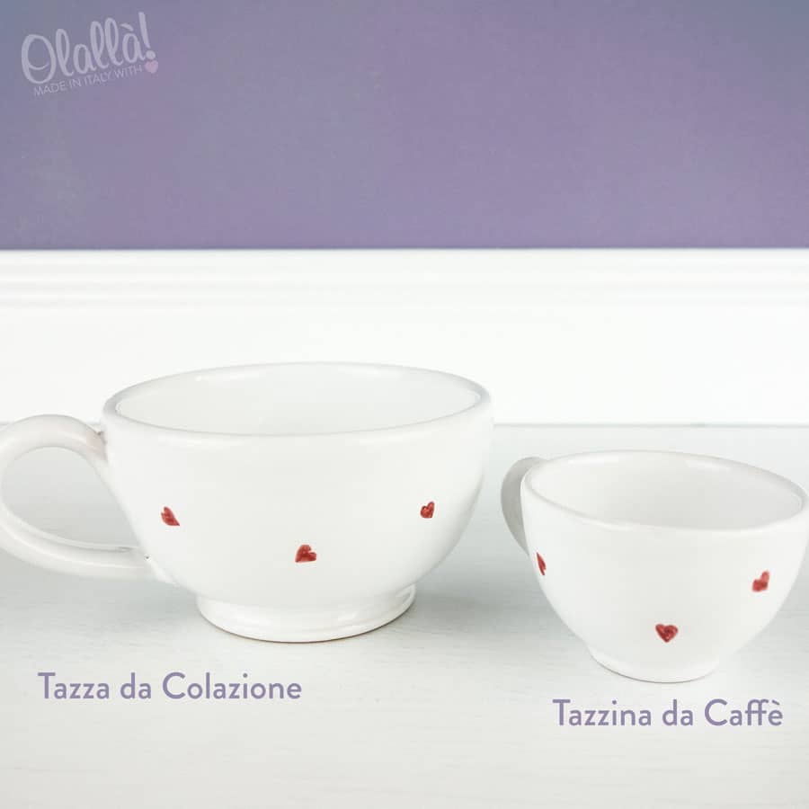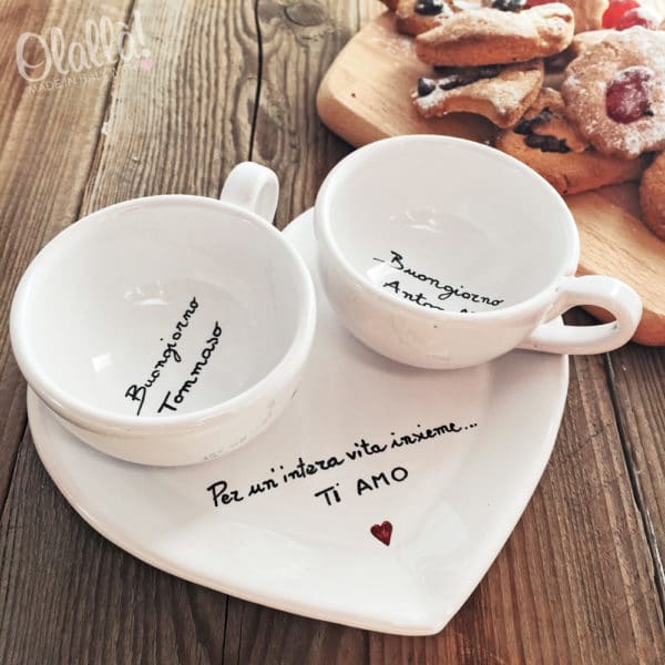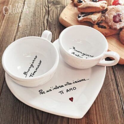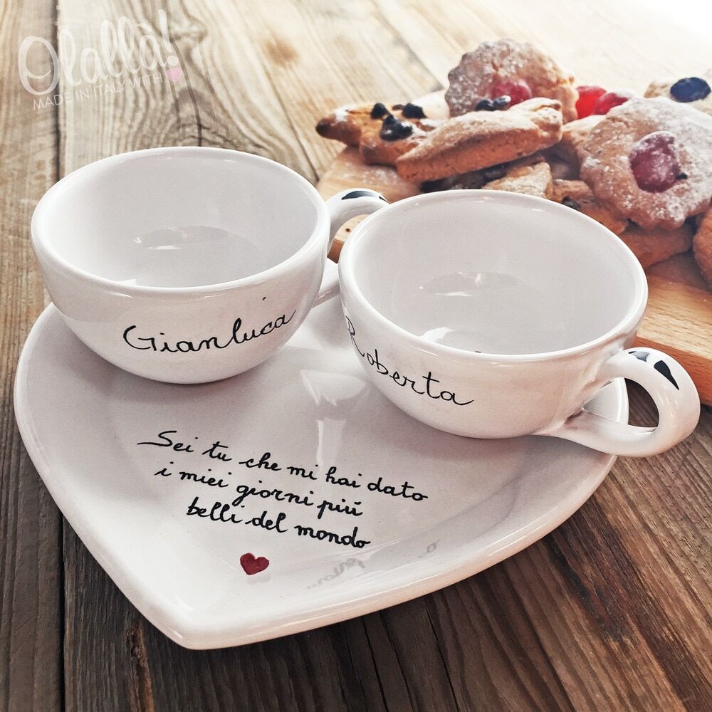 Tazzine da caffè o tè/cappuccino in ceramica smaltate e dipinte a mano da un’esperta ceramista. Lettere e decori sono realizzati a pennello, non scritti con penne o pennarelli indelebili: questi decori sono destinati a durare per sempre, lavaggio dopo lavaggio anche in lavastoviglie. Il set comprende 2 tazzine da caffé o tè/cappuccino e 1 vassoietto oppure vassoio a cuore.