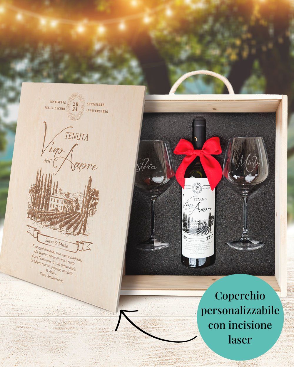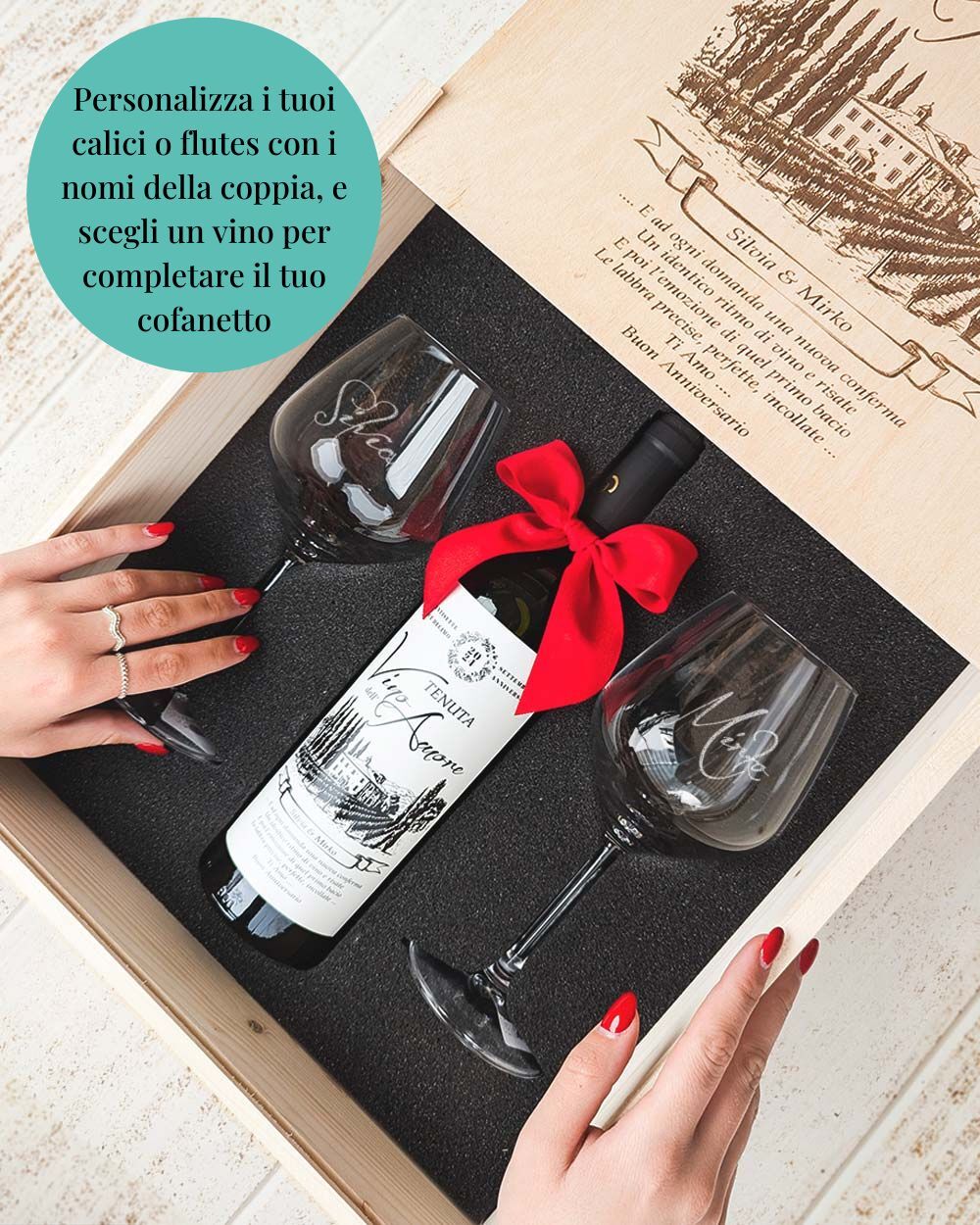 Il Set Cofanetto in Legno “Tenuta Vino dell’Amore” è la scelta ideale per chi desidera celebrare l’amore con eleganza e personalizzazione. Questo esclusivo set comprende due calici o flute personalizzabili con il nome dei destinatari, una bottiglia di vino con un’etichetta unica e un coperchio inciso con nomi, data e una dedica speciale. È un dono che parla di voi o dei destinatari e del vostro legame, perfetto per brindare insieme ai ricordi più belli.