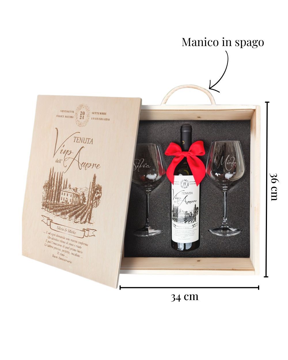 - Cofanetto in legno con manico in spago, interno in materiale preformato nero e coperchio che può essere personalizzato con incisione laser. Al suo interno contiene due calici in vetro personalizzabili e una bottiglia di vino con etichetta personalizzata (alcune tipologie di vino sono comprese nel prezzo, altre hanno un prezzo aggiuntivo) oppure una bottiglia di vino pregiata (senza etichetta personalizzabile).