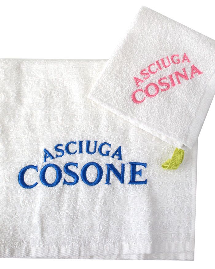 Set coordinato di asciugamani bianchi ricamati con la scritta “Asciuga Cosone” e “Asciuga Cosina”.