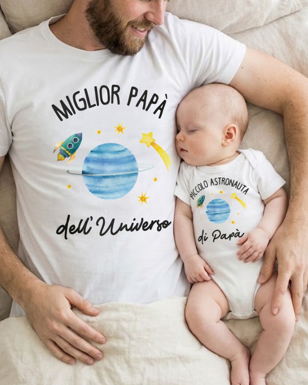 Trovare il giusto regalo per il papà non è mai stato così tenero e denso di significato. Questo set strapperà senza dubbio una lacrima di gioia. Vedere il proprio partner stringere al petto il suo bambino, uniti dalla stessa maglia a tema spaziale, è una scena che scalda il cuore e che fotograferete per sempre nella vostra mente. È l’idea infallibile per far crollare anche i papà più duri, regalando la certezza di essere il centro dell’universo.